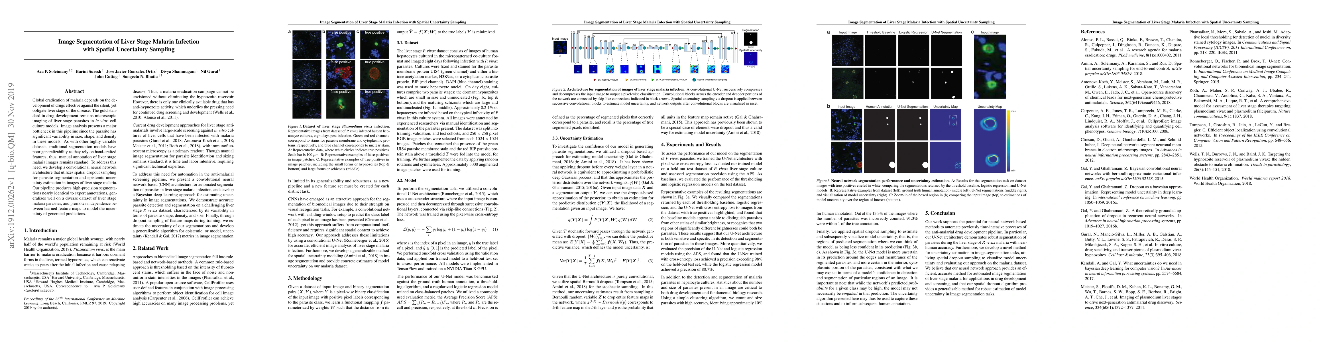 Global eradication of malaria depends on the development of drugs effective against the silent, yet obligate liver stage of the disease. The gold standard in drug development remains microscopic imaging of liver stage parasites in in vitro cell culture models. Image analysis presents a major bottleneck in this pipeline since the parasite has significant variability in size, shape, and density in these models. As with other highly variable datasets, traditional segmentation models have poor generalizability as they rely on hand-crafted features; thus, manual annotation of liver stage malaria images remains standard. To address this need, we develop a convolutional neural network architecture that utilizes spatial dropout sampling for parasite segmentation and epistemic uncertainty estimation in images of liver stage malaria. Our pipeline produces high-precision segmentations nearly identical to expert annotations, generalizes well on a diverse dataset of liver stage malaria parasites, and promotes independence between learned feature maps to model the uncertainty of generated predictions.