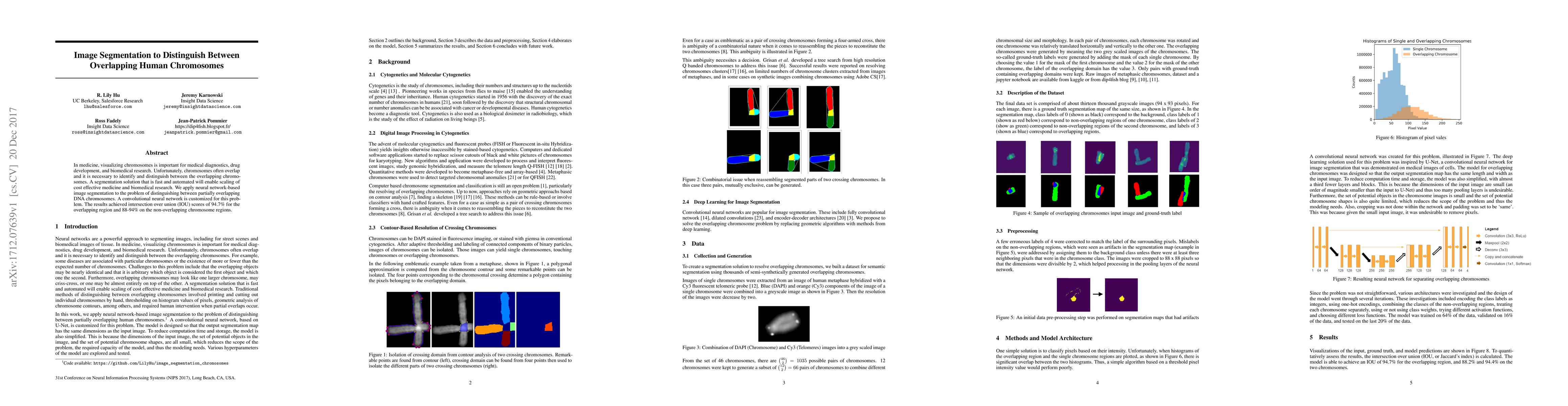 In medicine, visualizing chromosomes is important for medical diagnostics, drug development, and biomedical research. Unfortunately, chromosomes often overlap and it is necessary to identify and distinguish between the overlapping chromosomes. A segmentation solution that is fast and automated will enable scaling of cost effective medicine and biomedical research. We apply neural network-based image segmentation to the problem of distinguishing between partially overlapping DNA chromosomes. A convolutional neural network is customized for this problem. The results achieved intersection over union (IOU) scores of 94.7% for the overlapping region and 88-94% on the non-overlapping chromosome regions.
