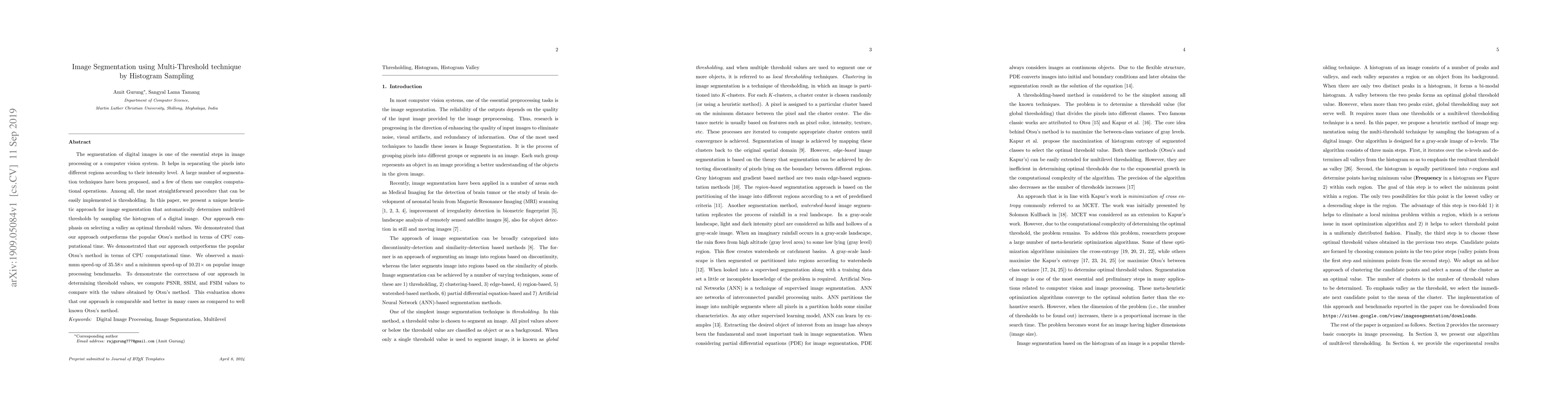 This paper proposes a heuristic multi-threshold image segmentation technique using histogram sampling to automatically determine optimal threshold values, achieving significant speed-up over Otsu's method and comparable or better image quality metrics.