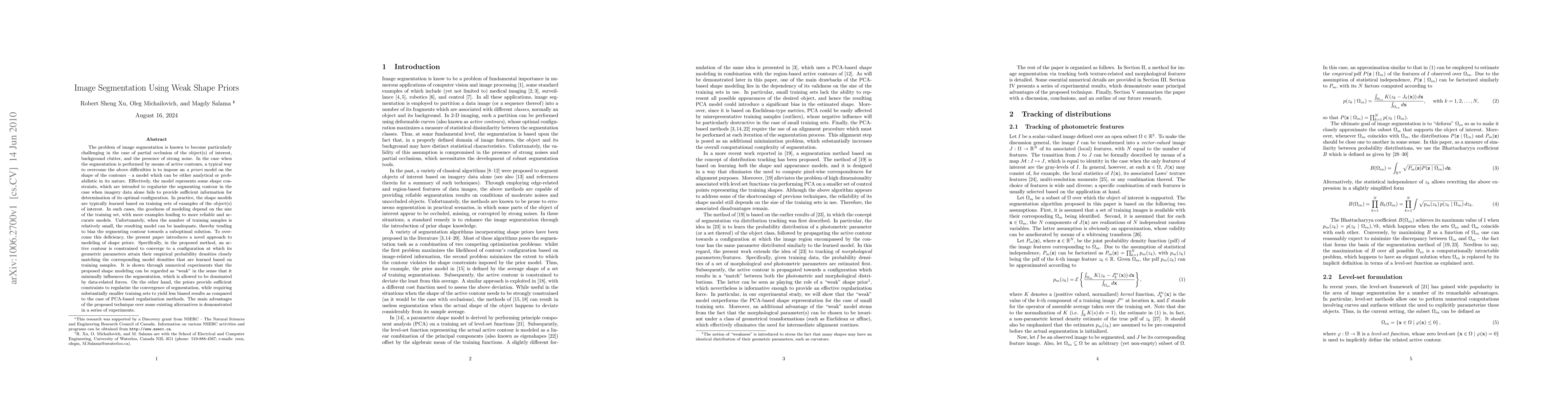 The problem of image segmentation is known to become particularly challenging in the case of partial occlusion of the object(s) of interest, background clutter, and the presence of strong noise. To overcome this problem, the present paper introduces a novel approach segmentation through the use of "weak" shape priors. Specifically, in the proposed method, an segmenting active contour is constrained to converge to a configuration at which its geometric parameters attain their empirical probability densities closely matching the corresponding model densities that are learned based on training samples. It is shown through numerical experiments that the proposed shape modeling can be regarded as "weak" in the sense that it minimally influences the segmentation, which is allowed to be dominated by data-related forces. On the other hand, the priors provide sufficient constraints to regularize the convergence of segmentation, while requiring substantially smaller training sets to yield less biased results as compared to the case of PCA-based regularization methods. The main advantages of the proposed technique over some existing alternatives is demonstrated in a series of experiments.
