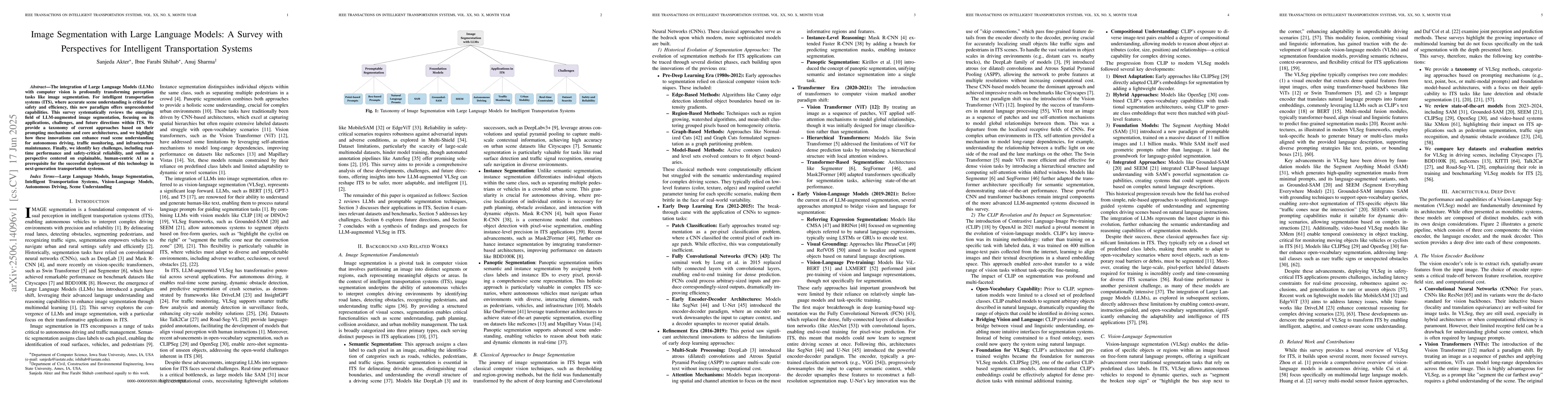 The integration of Large Language Models (LLMs) with computer vision is profoundly transforming perception tasks like image segmentation. For intelligent transportation systems (ITS), where accurate scene understanding is critical for safety and efficiency, this new paradigm offers unprecedented capabilities. This survey systematically reviews the emerging field of LLM-augmented image segmentation, focusing on its applications, challenges, and future directions within ITS. We provide a taxonomy of current approaches based on their prompting mechanisms and core architectures, and we highlight how these innovations can enhance road scene understanding for autonomous driving, traffic monitoring, and infrastructure maintenance. Finally, we identify key challenges, including real-time performance and safety-critical reliability, and outline a perspective centered on explainable, human-centric AI as a prerequisite for the successful deployment of this technology in next-generation transportation systems.