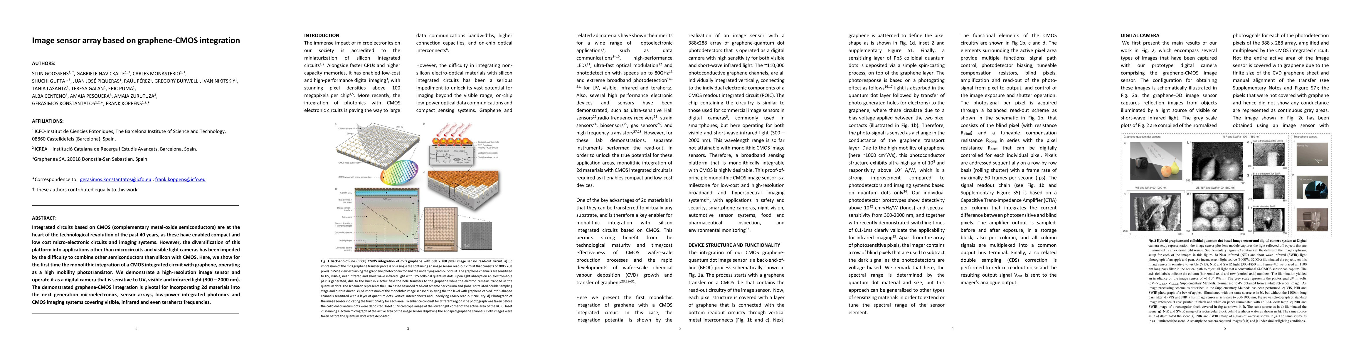 This paper presents the first successful monolithic integration of a CMOS circuit with graphene, functioning as a high mobility phototransistor, to create a high-resolution image sensor sensitive to UV, visible, and infrared light, paving the way for advanced microelectronics and imaging systems.