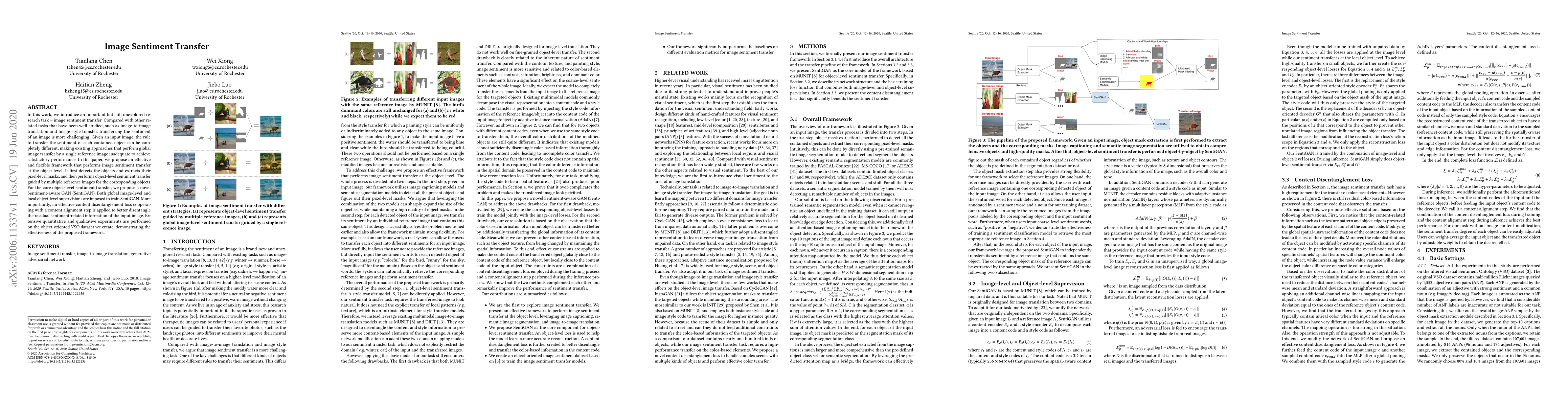 This paper introduces a novel framework for image sentiment transfer, focusing on object-level sentiment manipulation using a Sentiment-aware GAN (SentiGAN) that employs both global and local supervisions. The proposed method detects objects, extracts their masks, and transfers sentiment guided by multiple reference images, demonstrating effectiveness on a newly created object-oriented dataset.
