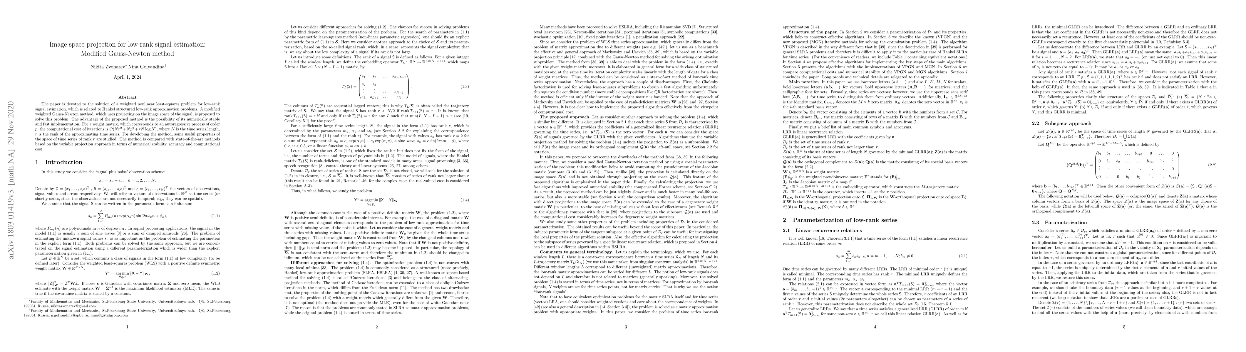 The paper proposes a modified weighted Gauss-Newton method for solving weighted nonlinear least-squares problems in low-rank signal estimation, projecting onto the image space for stability and speed. The method's computational cost is analyzed and compared favorably with other state-of-the-art techniques.