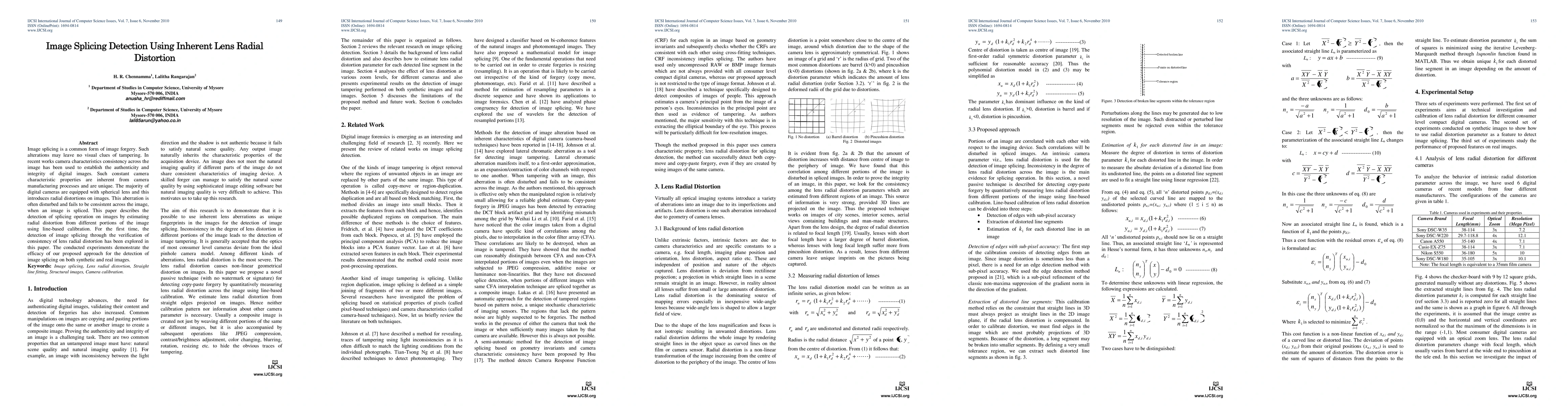This paper proposes a method for detecting image splicing by analyzing the consistency of lens radial distortion across different image regions. Experiments show the effectiveness of this approach in identifying tampered images using inherent camera characteristics.