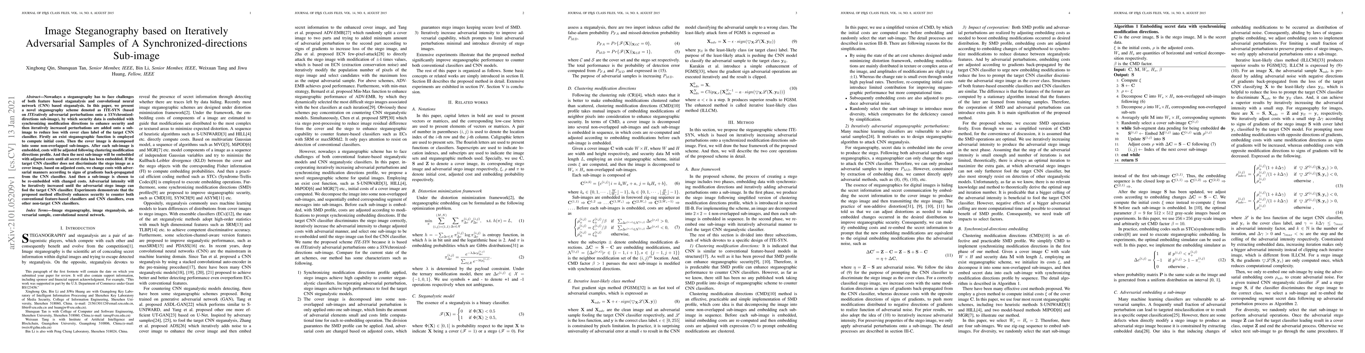 This paper introduces ITE-SYN, a steganography scheme that iteratively enhances security against steganalysis by embedding data into synchronized sub-images and applying adversarial perturbations to evade detection by both feature-based and CNN classifiers. The method iteratively adjusts embedding costs and increases adversarial intensity to fool target CNN classifiers.