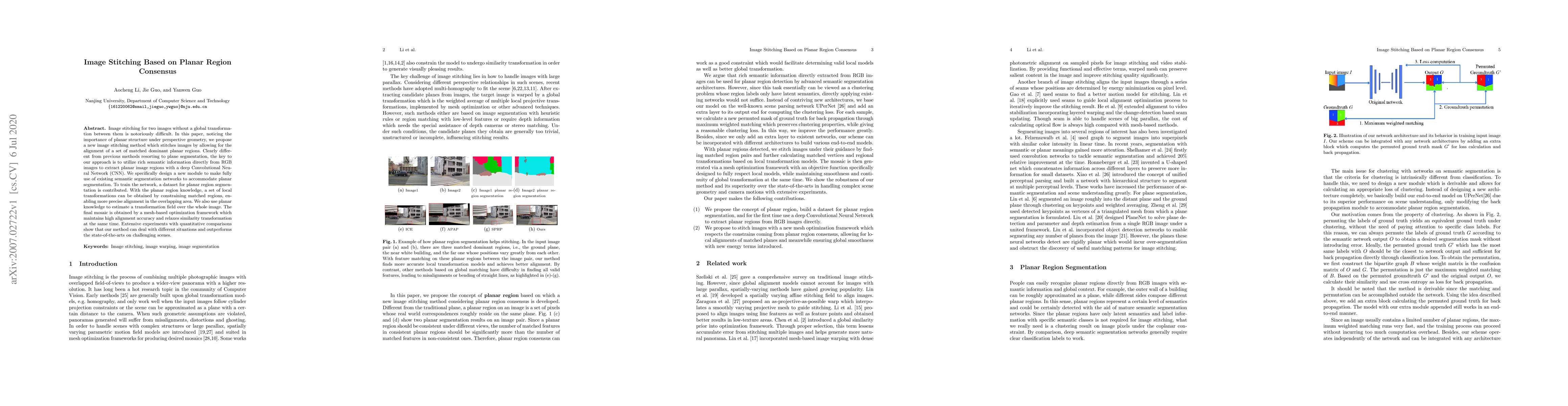 A new image stitching method uses planar region consensus to align images without a global transformation, outperforming state-of-the-art methods on challenging scenes.