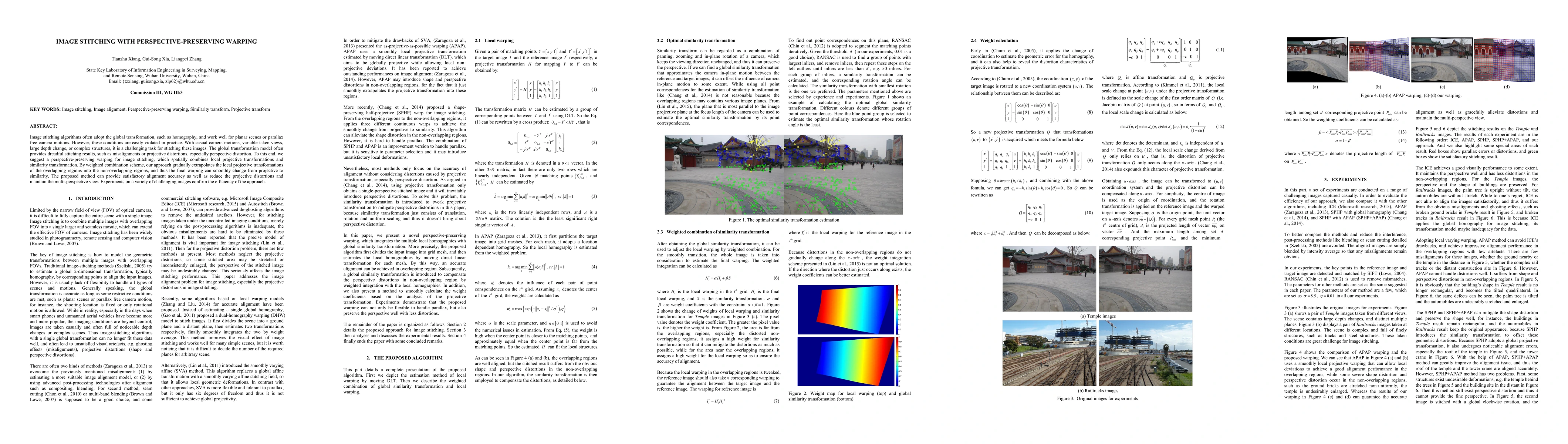 This paper proposes a perspective-preserving warping method for image stitching that combines local projective transformations with similarity transformations to handle complex camera motions and large depth variations. The weighted combination scheme ensures smooth transitions, reducing distortions and maintaining multi-perspective views, as confirmed by experiments on challenging images.