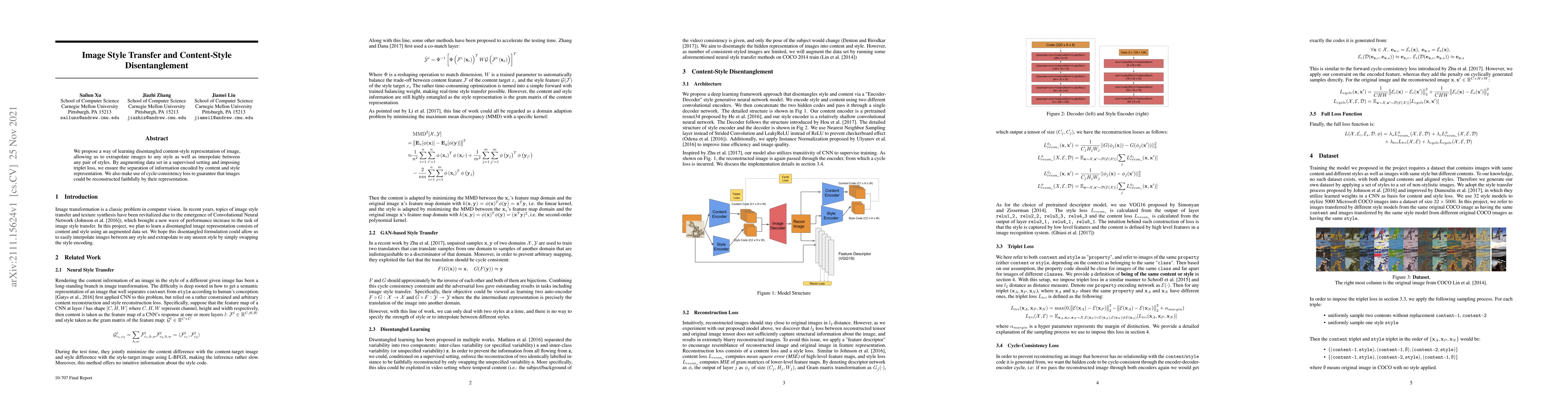 Researchers propose a method to learn disentangled content-style representations of images, allowing for style transfer and interpolation between styles. This approach uses triplet loss and cycle-consistency loss to ensure faithful image reconstruction.
