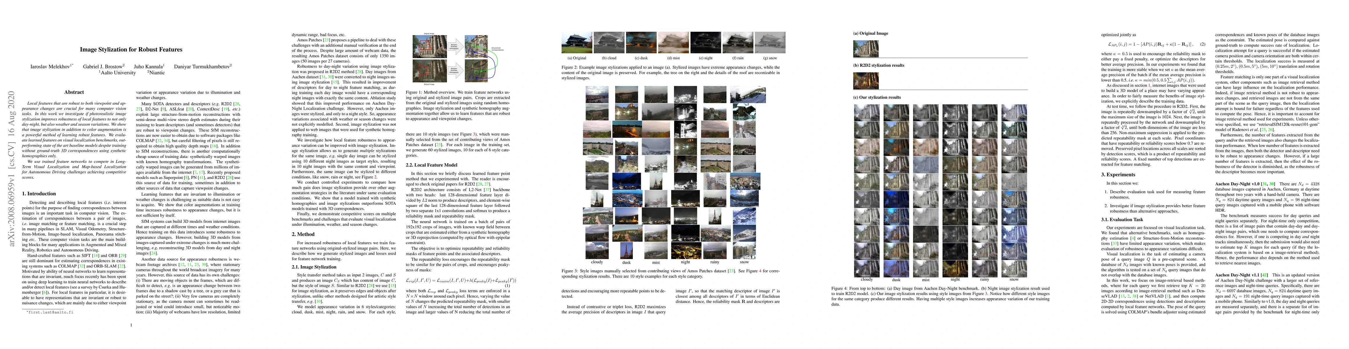 Local features that are robust to both viewpoint and appearance changes are crucial for many computer vision tasks. In this work we investigate if photorealistic image stylization improves robustness of local features to not only day-night, but also weather and season variations. We show that image stylization in addition to color augmentation is a powerful method of learning robust features. We evaluate learned features on visual localization benchmarks, outperforming state of the art baseline models despite training without ground-truth 3D correspondences using synthetic homographies only. We use trained feature networks to compete in Long-Term Visual Localization and Map-based Localization for Autonomous Driving challenges achieving competitive scores.