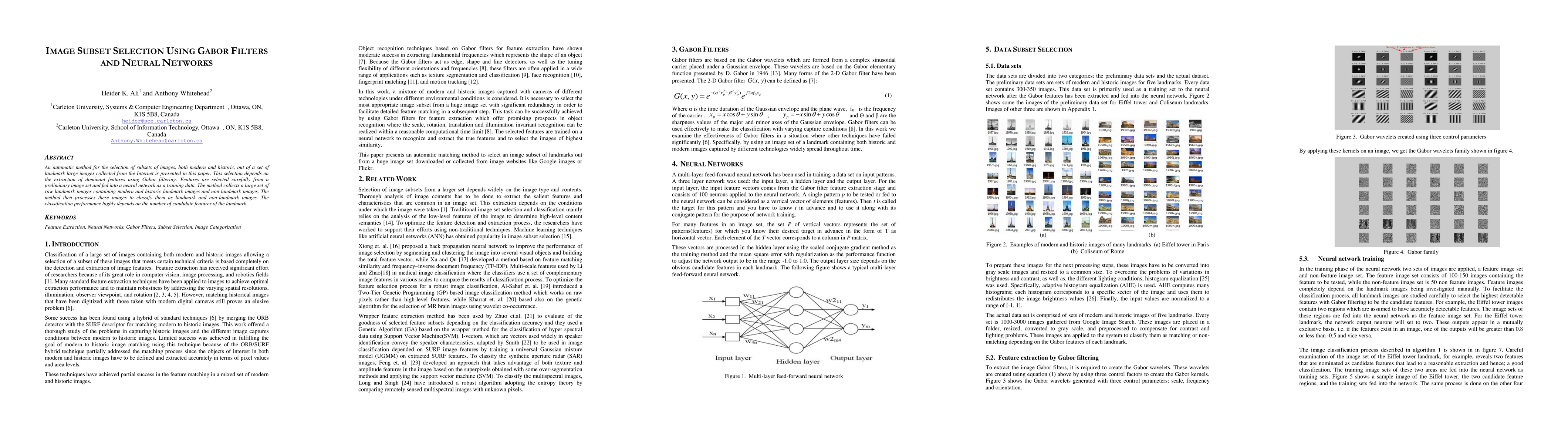 An automatic method for the selection of subsets of images, both modern and historic, out of a set of landmark large images collected from the Internet is presented in this paper. This selection depends on the extraction of dominant features using Gabor filtering. Features are selected carefully from a preliminary image set and fed into a neural network as a training data. The method collects a large set of raw landmark images containing modern and historic landmark images and non-landmark images. The method then processes these images to classify them as landmark and non-landmark images. The classification performance highly depends on the number of candidate features of the landmark.