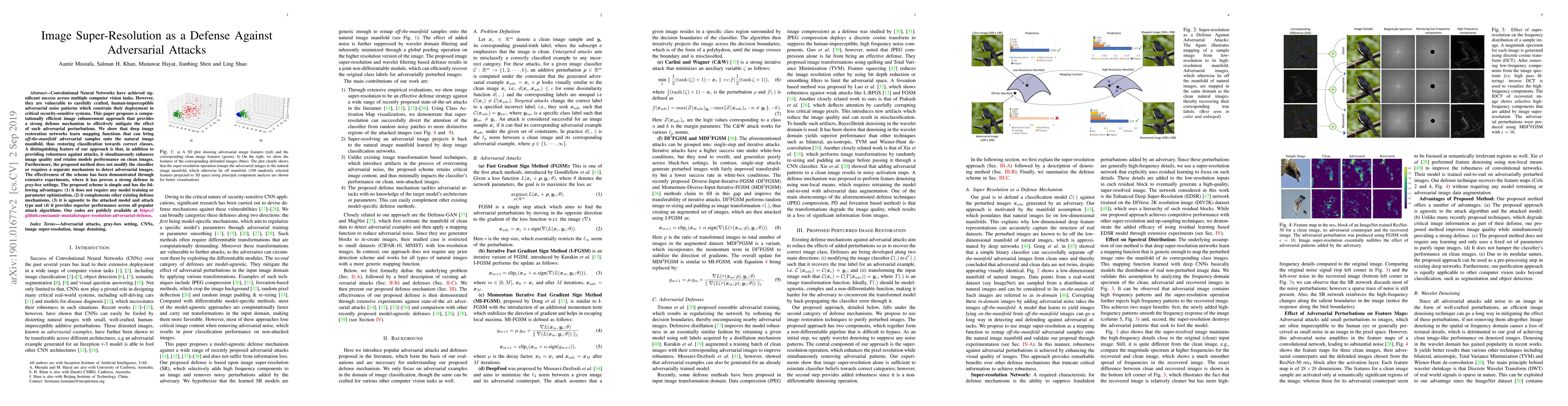 This paper proposes an image super-resolution technique to defend against adversarial attacks on Convolutional Neural Networks by restoring perturbed images to the natural manifold, enhancing image quality, and maintaining model performance on clean images. The method is simple, requires no additional training, and complements existing defenses without needing model modifications.