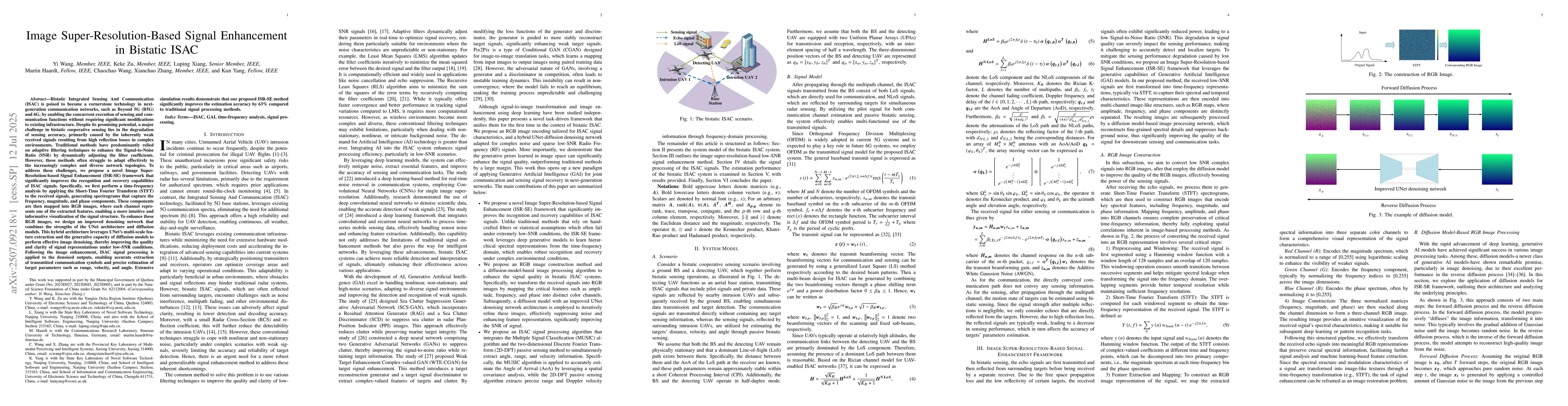 Bistatic Integrated Sensing and Communication (ISAC) is poised to become a cornerstone technology in next-generation communication networks, such as Beyond 5G (B5G) and 6G, by enabling the concurrent execution of sensing and communication functions without requiring significant modifications to existing infrastructure. Despite its promising potential, a major challenge in bistatic cooperative sensing lies in the degradation of sensing accuracy, primarily caused by the inherently weak received signals resulting from high reflection losses in complex environments. Traditional methods have predominantly relied on adaptive filtering techniques to enhance the Signal-to-Noise Ratio (SNR) by dynamically adjusting the filter coefficients. However, these methods often struggle to adapt effectively to the increasingly complex and diverse network topologies. To address these challenges, we propose a novel Image Super-Resolution-based Signal Enhancement (ISR-SE) framework that significantly improves the recognition and recovery capabilities of ISAC signals. Specifically, we first perform a time-frequency analysis by applying the Short-Time Fourier Transform (STFT) to the received signals, generating spectrograms that capture the frequency, magnitude, and phase components. These components are then mapped into RGB images, where each channel represents one of the extracted features, enabling a more intuitive and informative visualization of the signal structure. To enhance these RGB images, we design an improved denoising network that combines the strengths of the UNet architecture and diffusion models. This hybrid architecture leverages UNet's multi-scale feature extraction and the generative capacity of diffusion models to perform effective image denoising, thereby improving the quality and clarity of signal representations under low-SNR conditions.
