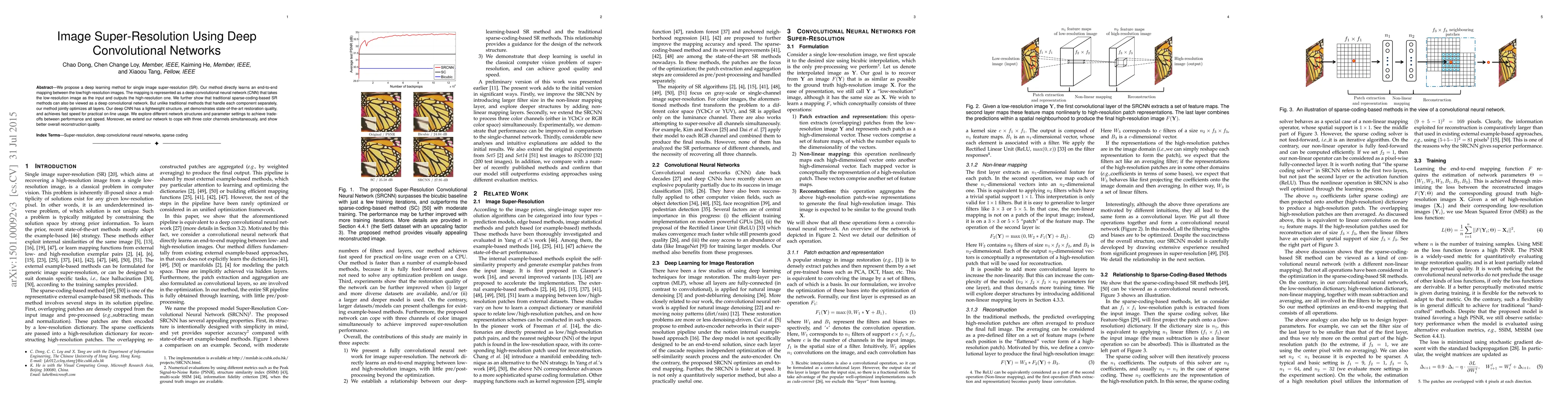 This paper proposes a deep convolutional neural network for single image super-resolution, achieving state-of-the-art quality by jointly optimizing all layers. The method outperforms traditional sparse-coding-based approaches and offers a balance between performance and speed.