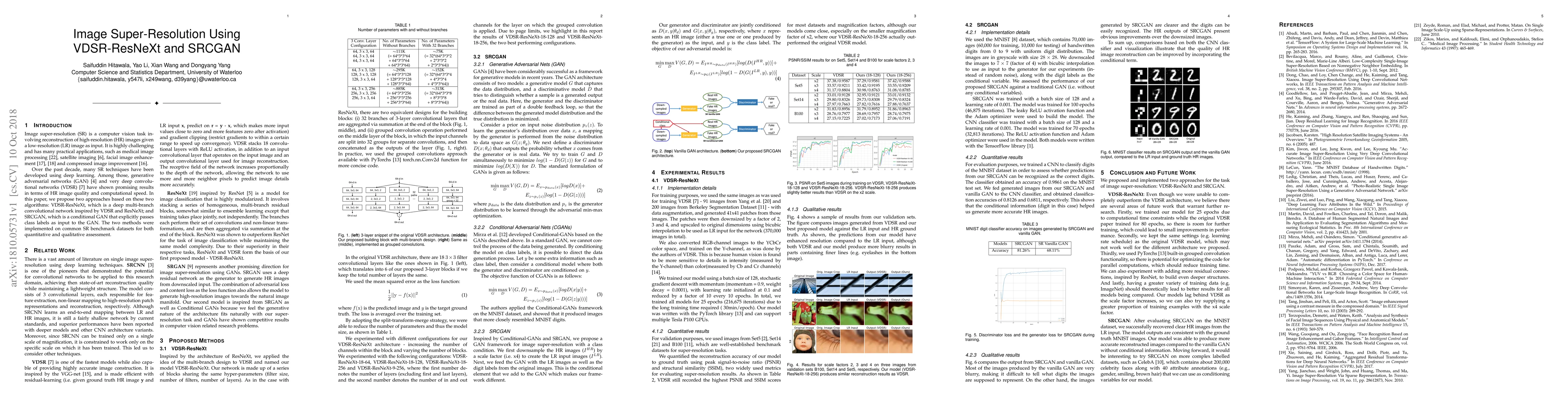 This paper proposes two image super-resolution methods: VDSR-ResNeXt, a deep multi-branch convolutional network combining VDSR and ResNeXt, and SRCGAN, a conditional GAN that uses class labels to enhance image quality. Both methods were evaluated on standard datasets for quantitative and qualitative performance.
