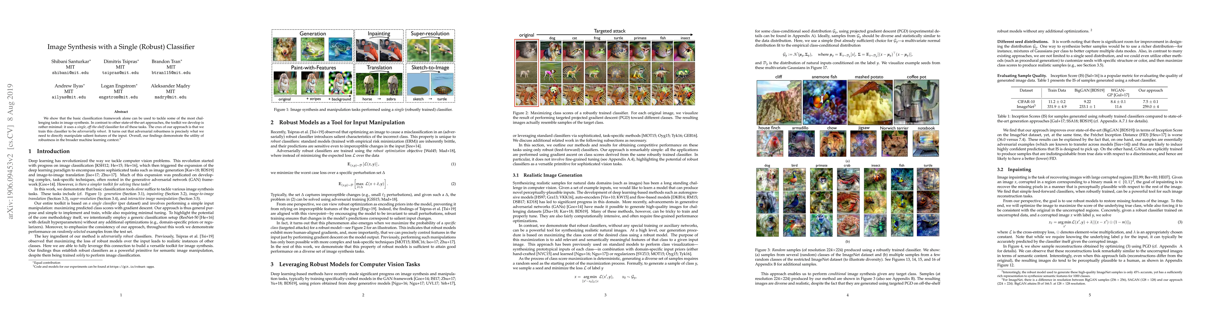 This paper demonstrates that a single, robust classifier can effectively tackle image synthesis challenges, leveraging adversarial training to manipulate salient features. The simplicity of the approach highlights the importance of robustness in machine learning applications.