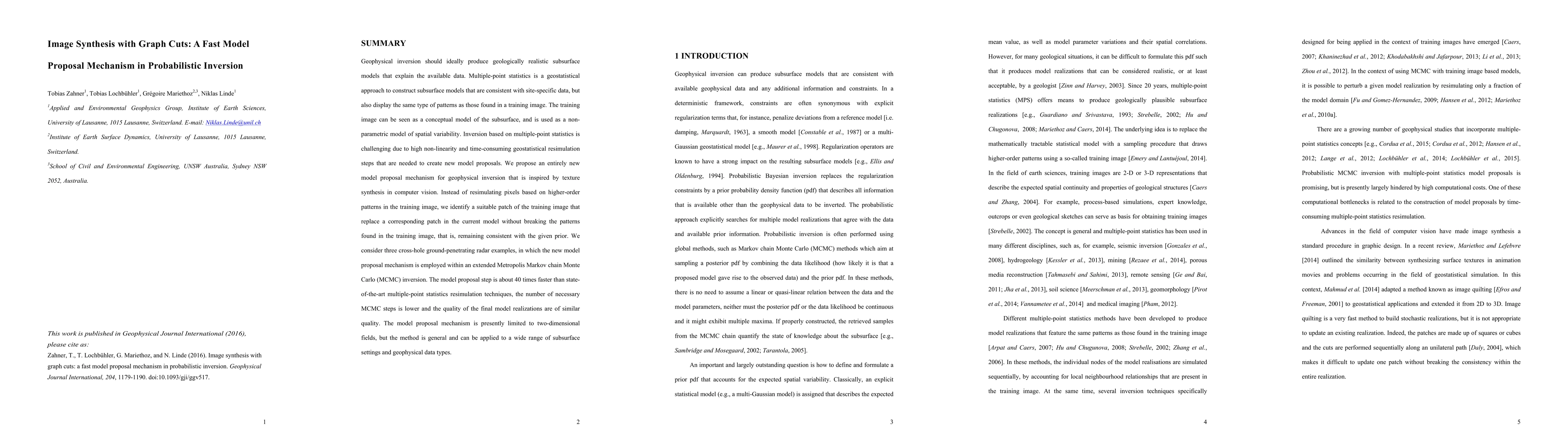 Geophysical inversion should ideally produce geologically realistic subsurface models that explain the available data. Multiple-point statistics is a geostatistical approach to construct subsurface models that are consistent with site-specific data, but also display the same type of patterns as those found in a training image. The training image can be seen as a conceptual model of the subsurface and is used as a non-parametric model of spatial variability. Inversion based on multiple-point statistics is challenging due to high nonlinearity and time-consuming geostatistical resimulation steps that are needed to create new model proposals. We propose an entirely new model proposal mechanism for geophysical inversion that is inspired by texture synthesis in computer vision. Instead of resimulating pixels based on higher-order patterns in the training image, we identify a suitable patch of the training image that replace a corresponding patch in the current model without breaking the patterns found in the training image, that is, remaining consistent with the given prior. We consider three cross-hole ground-penetrating radar examples in which the new model proposal mechanism is employed within an extended Metropolis Markov chain Monte Carlo (MCMC) inversion. The model proposal step is about 40 times faster than state-of-the-art multiple-point statistics resimulation techniques, the number of necessary MCMC steps is lower and the quality of the final model realizations is of similar quality. The model proposal mechanism is presently limited to 2-D fields, but the method is general and can be applied to a wide range of subsurface settings and geophysical data types.
