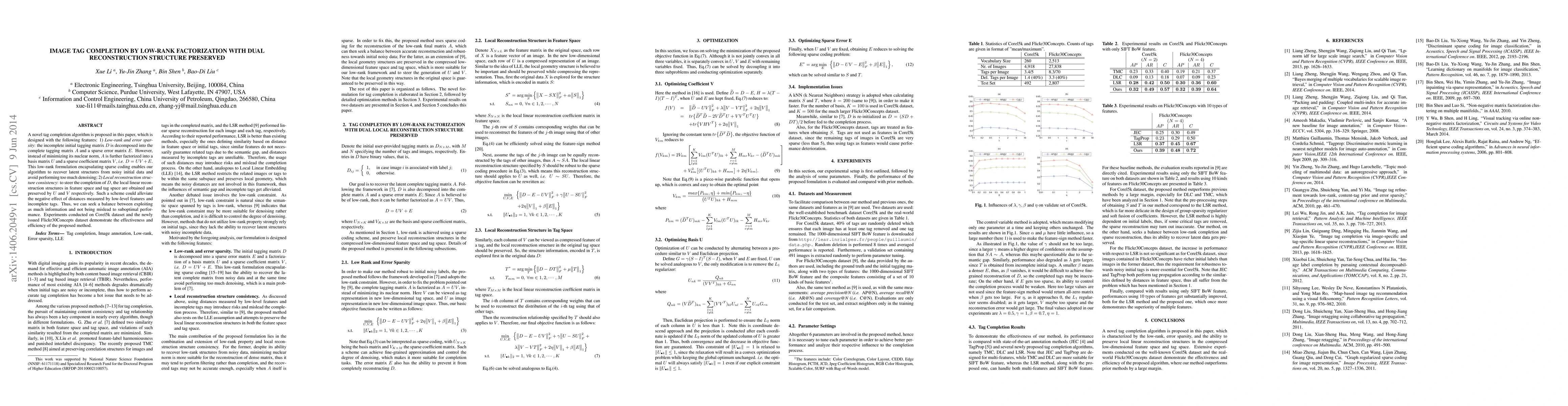 This paper proposes a novel tag completion algorithm using low-rank factorization with dual reconstruction, which decomposes incomplete tagging matrices into complete matrices and sparse error matrices, preserving local reconstruction structures to balance information exploitation and avoid suboptimal performance. Experiments on Corel5k and Flickr30Concepts datasets show its effectiveness.