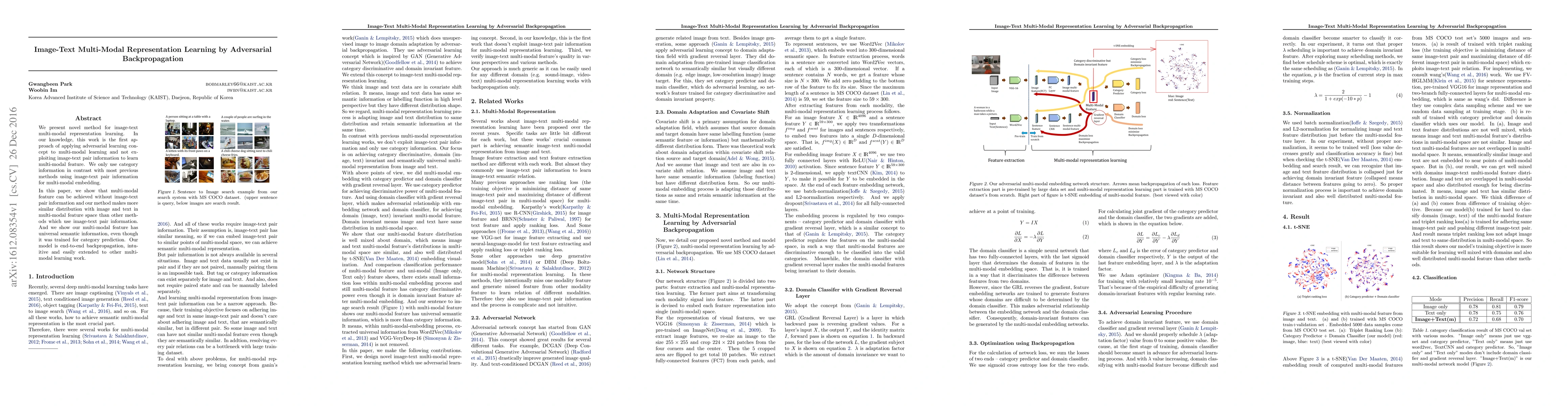 This paper introduces a novel adversarial backpropagation method for image-text multi-modal representation learning using only category information, instead of image-text pairs, achieving a more similar distribution in the multi-modal feature space and demonstrating universal semantic information in the features. The model is end-to-end trainable and easily extendable.