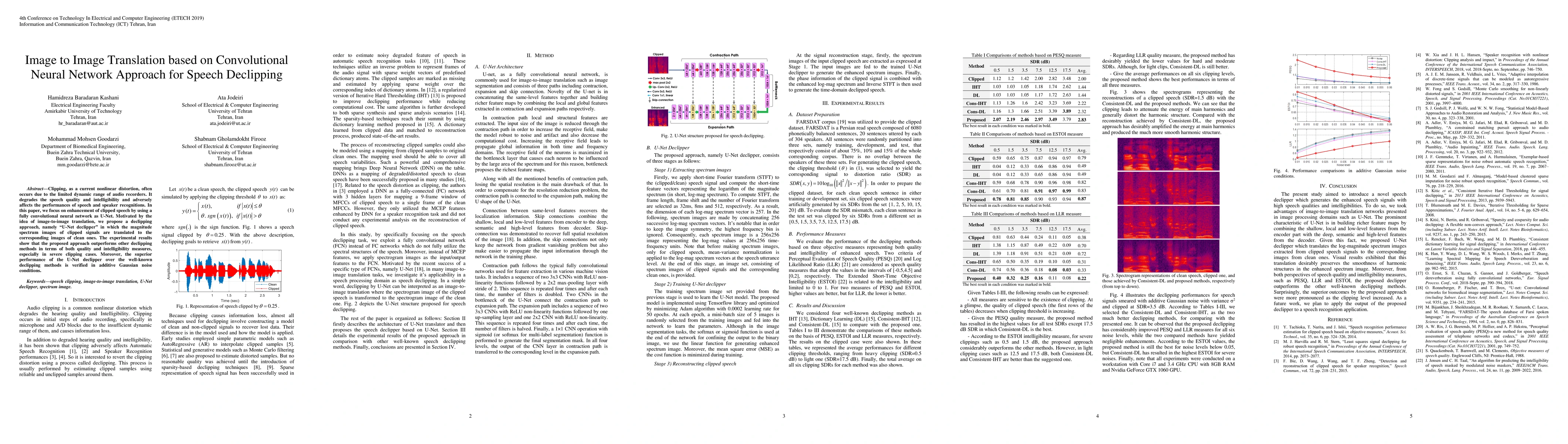 This paper proposes a U-Net-based convolutional neural network for speech declipping, translating magnitude spectrum images of clipped signals to clean ones. The U-Net declipper outperforms existing methods in quality and intelligibility, especially under severe clipping and noise conditions.