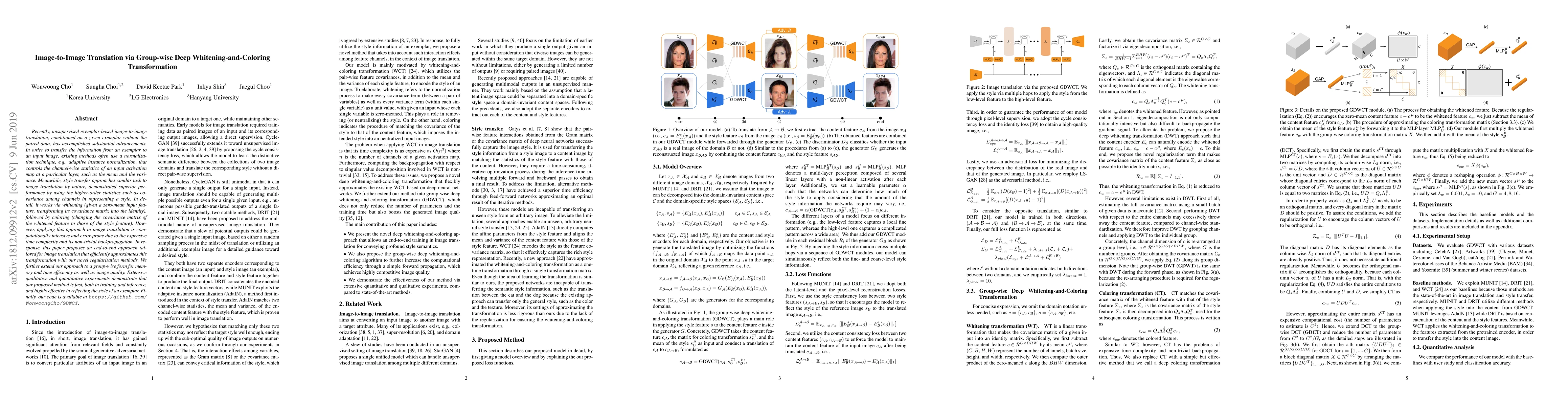 This paper proposes a novel approach to image-to-image translation that efficiently approximates style transfer using group-wise deep whitening-and-coloring transformation, achieving fast training and inference while maintaining high image quality.
