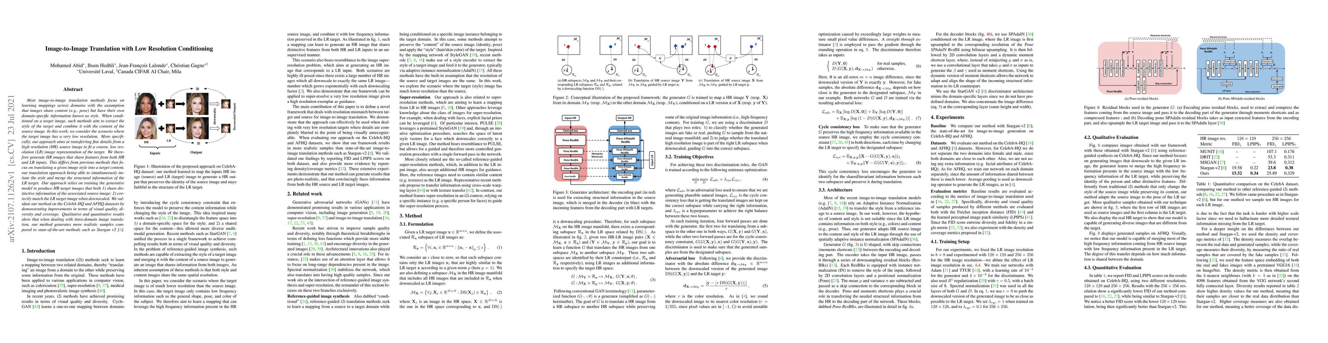 Most image-to-image translation methods focus on learning mappings across domains with the assumption that images share content (e.g., pose) but have their own domain-specific information known as style. When conditioned on a target image, such methods aim to extract the style of the target and combine it with the content of the source image. In this work, we consider the scenario where the target image has a very low resolution. More specifically, our approach aims at transferring fine details from a high resolution (HR) source image to fit a coarse, low resolution (LR) image representation of the target. We therefore generate HR images that share features from both HR and LR inputs. This differs from previous methods that focus on translating a given image style into a target content, our translation approach being able to simultaneously imitate the style and merge the structural information of the LR target. Our approach relies on training the generative model to produce HR target images that both 1) share distinctive information of the associated source image; 2) correctly match the LR target image when downscaled. We validate our method on the CelebA-HQ and AFHQ datasets by demonstrating improvements in terms of visual quality, diversity and coverage. Qualitative and quantitative results show that when dealing with intra-domain image translation, our method generates more realistic samples compared to state-of-the-art methods such as Stargan-v2