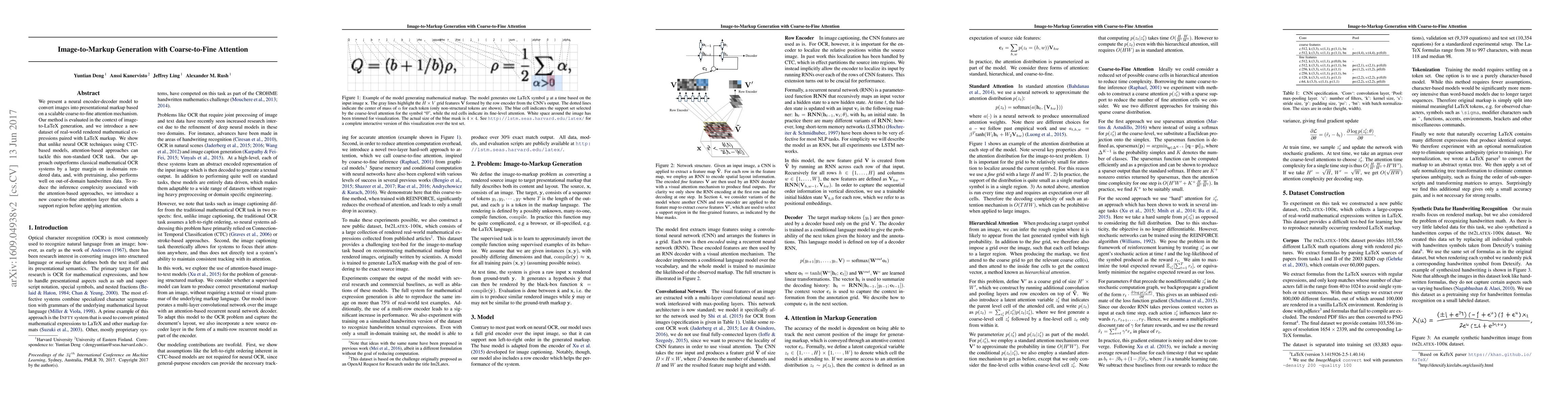 We present a neural encoder-decoder model to convert images into presentational markup based on a scalable coarse-to-fine attention mechanism. Our method is evaluated in the context of image-to-LaTeX generation, and we introduce a new dataset of real-world rendered mathematical expressions paired with LaTeX markup. We show that unlike neural OCR techniques using CTC-based models, attention-based approaches can tackle this non-standard OCR task. Our approach outperforms classical mathematical OCR systems by a large margin on in-domain rendered data, and, with pretraining, also performs well on out-of-domain handwritten data. To reduce the inference complexity associated with the attention-based approaches, we introduce a new coarse-to-fine attention layer that selects a support region before applying attention.