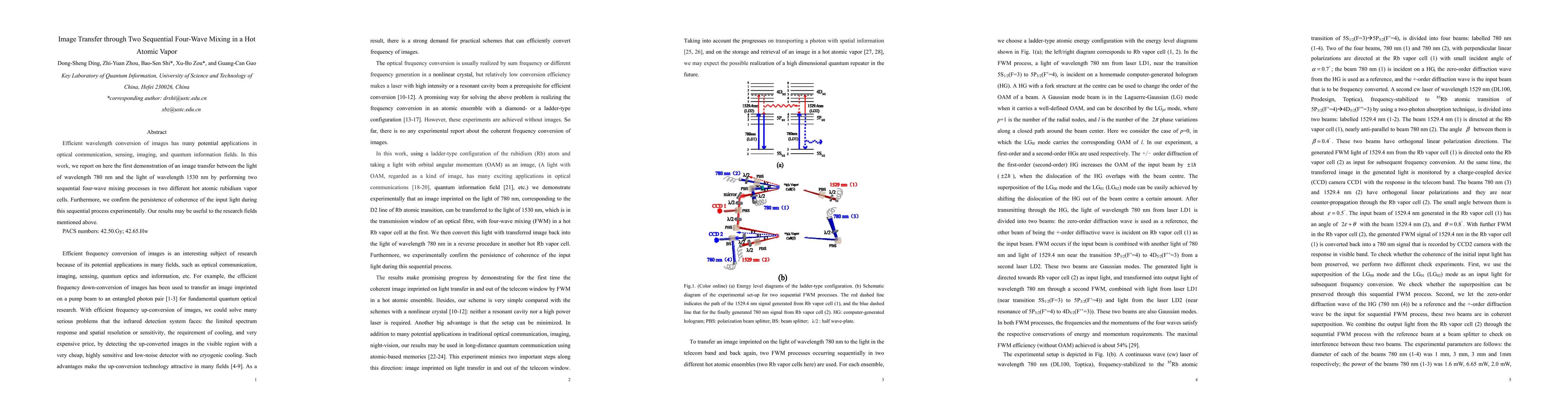 This paper demonstrates the first image transfer between 780 nm and 1530 nm wavelengths using two sequential four-wave mixing processes in hot atomic rubidium vapor cells, confirming coherence persistence and showing potential for optical communication and quantum information applications.