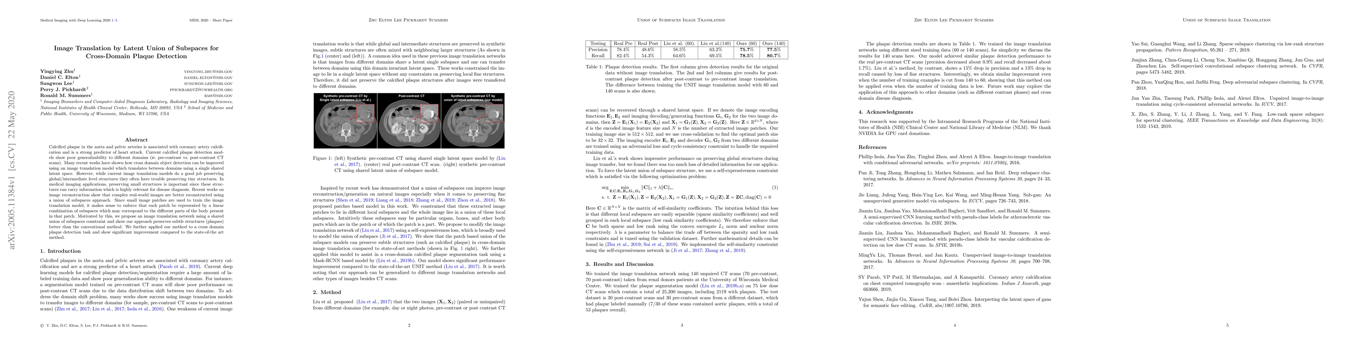 This paper proposes an image translation network using a shared latent union of subspaces to improve the detection of calcified plaques in medical imaging across different domains. The method better preserves small structures like plaques compared to conventional approaches, leading to significant improvements in cross-domain plaque detection.