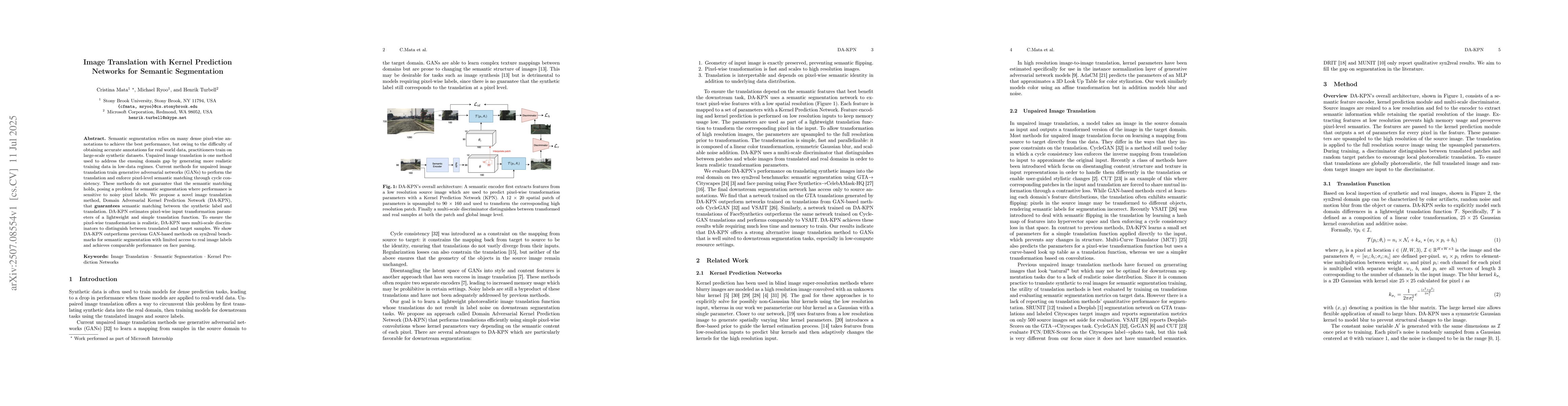 Semantic segmentation relies on many dense pixel-wise annotations to achieve the best performance, but owing to the difficulty of obtaining accurate annotations for real world data, practitioners train on large-scale synthetic datasets. Unpaired image translation is one method used to address the ensuing domain gap by generating more realistic training data in low-data regimes. Current methods for unpaired image translation train generative adversarial networks (GANs) to perform the translation and enforce pixel-level semantic matching through cycle consistency. These methods do not guarantee that the semantic matching holds, posing a problem for semantic segmentation where performance is sensitive to noisy pixel labels. We propose a novel image translation method, Domain Adversarial Kernel Prediction Network (DA-KPN), that guarantees semantic matching between the synthetic label and translation. DA-KPN estimates pixel-wise input transformation parameters of a lightweight and simple translation function. To ensure the pixel-wise transformation is realistic, DA-KPN uses multi-scale discriminators to distinguish between translated and target samples. We show DA-KPN outperforms previous GAN-based methods on syn2real benchmarks for semantic segmentation with limited access to real image labels and achieves comparable performance on face parsing.