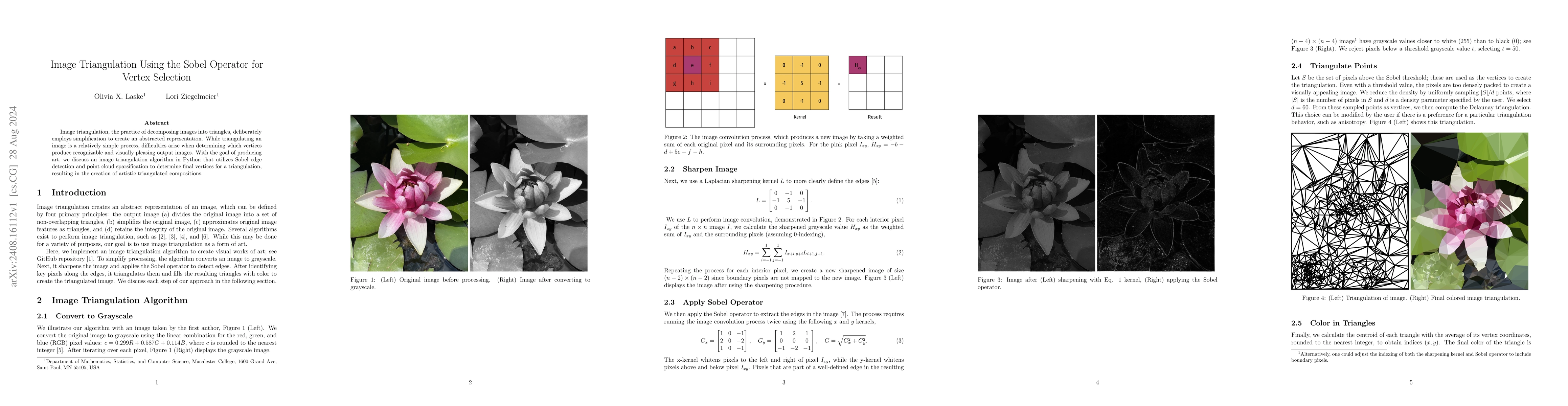 Image triangulation, the practice of decomposing images into triangles, deliberately employs simplification to create an abstracted representation. While triangulating an image is a relatively simple process, difficulties arise when determining which vertices produce recognizable and visually pleasing output images. With the goal of producing art, we discuss an image triangulation algorithm in Python that utilizes Sobel edge detection and point cloud sparsification to determine final vertices for a triangulation, resulting in the creation of artistic triangulated compositions.