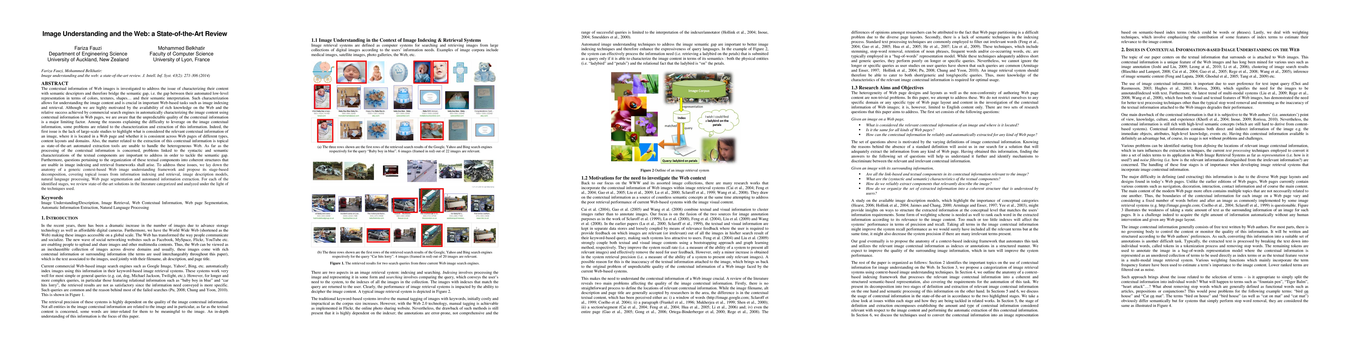 The contextual information of Web images is investigated to address the issue of characterizing their content with semantic descriptors and therefore bridge the semantic gap, i.e. the gap between their automated low-level representation in terms of colors, textures, shapes. . . and their semantic interpretation. Such characterization allows for understanding the image content and is crucial in important Web-based tasks such as image indexing and retrieval. Although we are highly motivated by the availability of rich knowledge on the Web and the relative success achieved by commercial search engines in automatically characterizing the image content using contextual information in Web pages, we are aware that the unpredictable quality of the contextual information is a major limiting factor. Among the reasons explaining the difficulty to leverage on the image contextual information, some problems are related to the characterization and extraction of this information. Indeed, the first issue is the lack of large-scale studies to highlight what is considered the relevant contextual information of an image, where it is located in a Web page and whether it is consistent across Web pages of different types, content layouts and domains. Also, the matter related to the extraction of this contextual information is topical as state-of-the-art automated extraction tools are unable to handle the heterogeneous Web. As far as the processing of the contextual information is concerned, problems linked to the syntactic and semantic characterizations of the textual components are important to address in order to tackle the semantic gap. Furthermore, questions pertaining to the organization of these textual components into coherent structures that are usable in image indexing and retrieval frameworks shall arise.