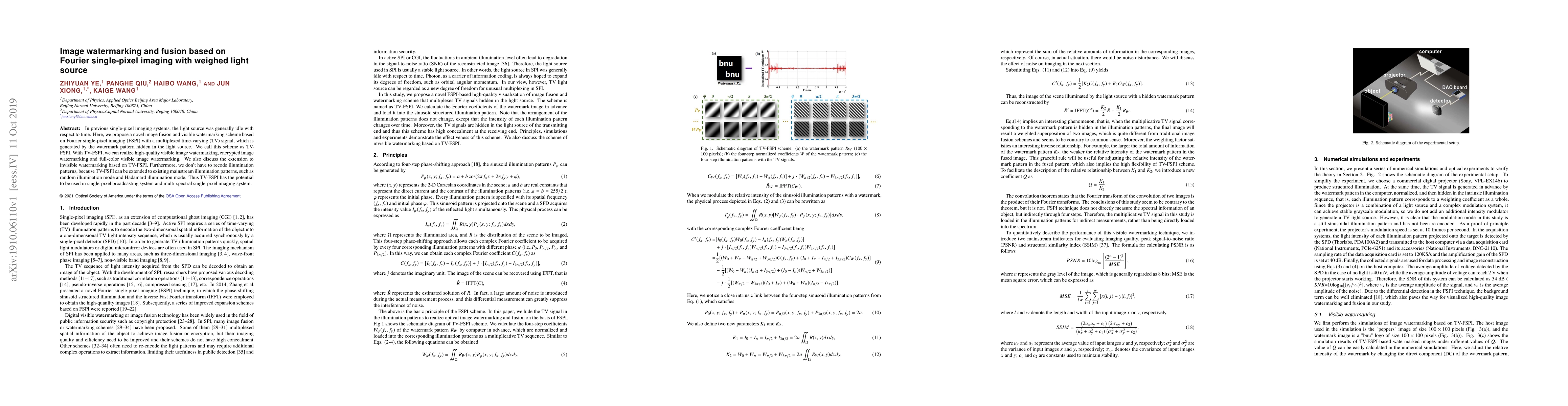 This paper proposes a novel image fusion and visible watermarking scheme using Fourier single-pixel imaging (FSPI) with a time-varying signal generated by a hidden watermark pattern. The scheme, termed TV-FSPI, enables high-quality visible, encrypted, and full-color watermarking without requiring recoded illumination patterns.