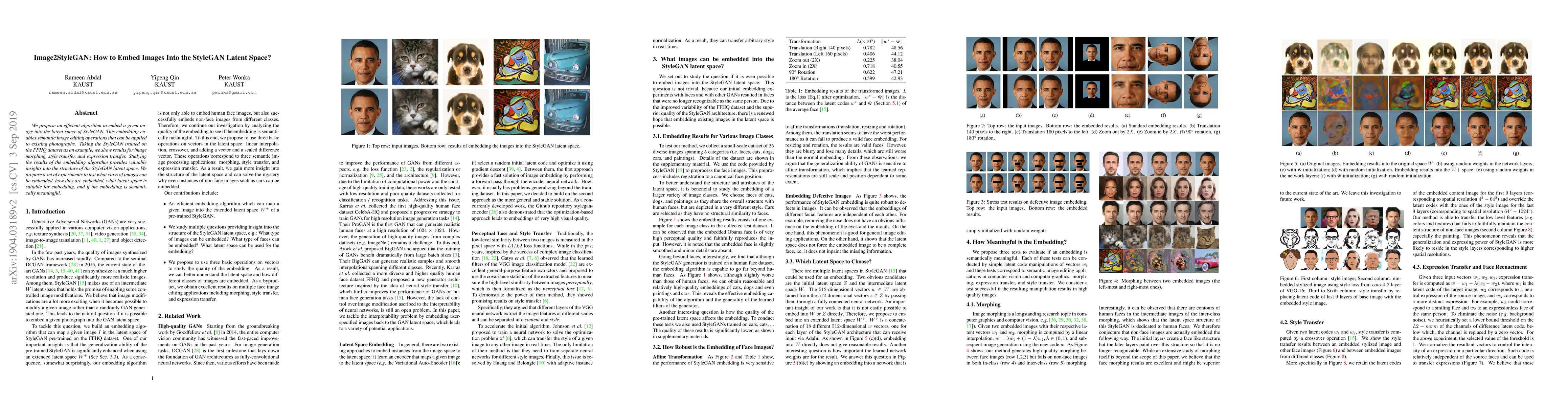 This paper introduces an algorithm to embed images into the StyleGAN latent space, enabling semantic editing like morphing, style transfer, and expression transfer. The study explores the embedding's effectiveness and provides insights into the latent space structure through various experiments.