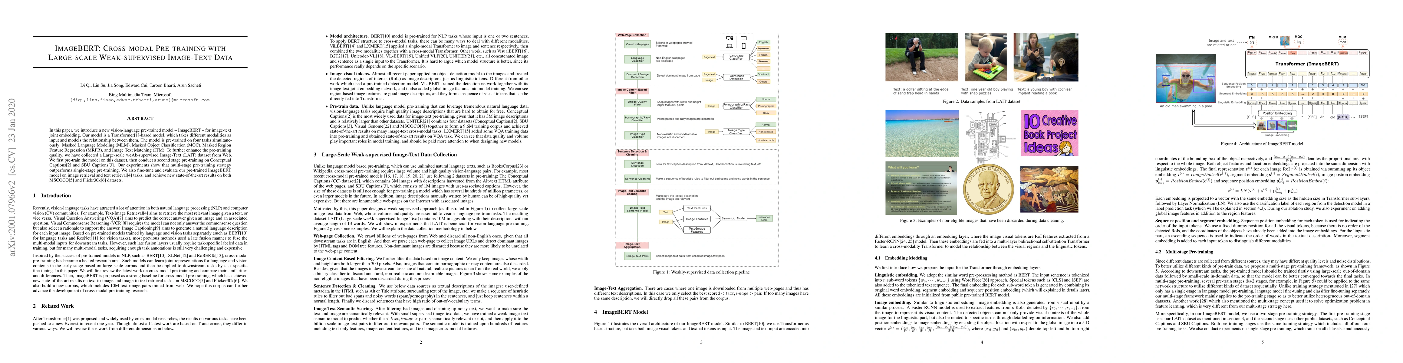 ImageBERT is a Transformer-based vision-language pre-trained model that jointly embeds images and text through multi-task pre-training on Masked Language Modeling, Masked Object Classification, Masked Region Feature Regression, and Image Text Matching. It achieves state-of-the-art results on image and text retrieval tasks after pre-training on a large-scale weak-supervised LAIT dataset and fine-tuning on Conceptual Captions and SBU Captions.