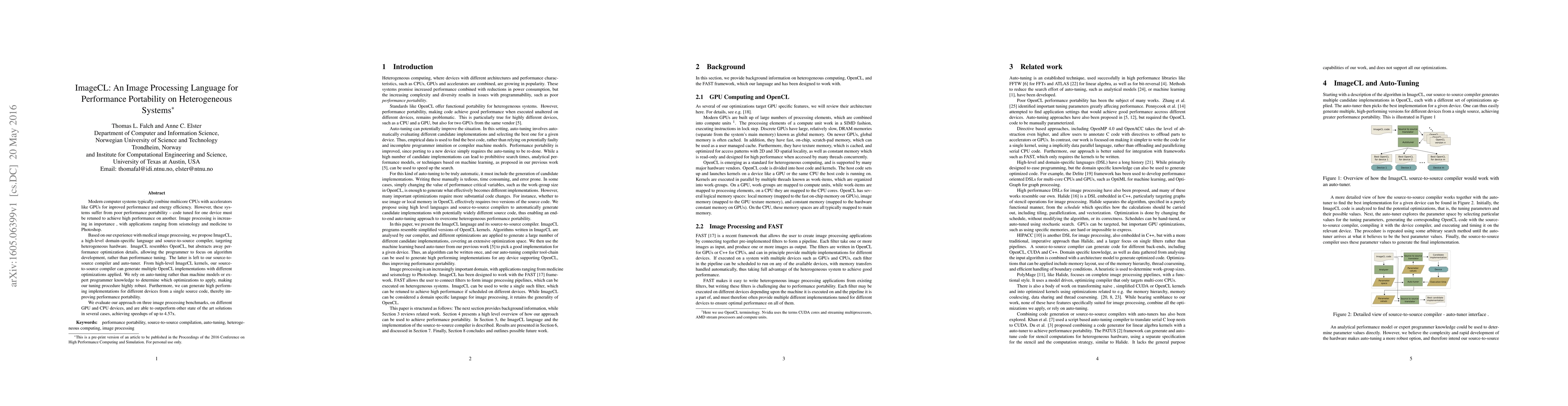 ImageCL is a high-level domain-specific language designed to improve performance portability for image processing on heterogeneous systems. It abstracts performance optimization details, allowing developers to focus on algorithm development while the compiler and auto-tuner handle tuning, achieving up to 4.57x speedups over other solutions.