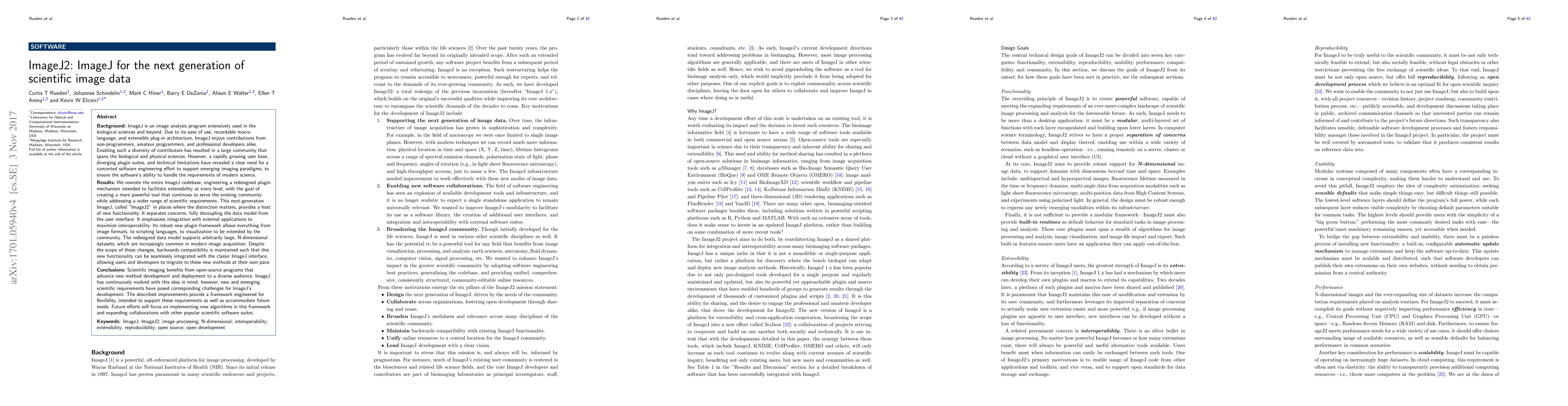 ImageJ2 is a comprehensive redesign of the popular ImageJ software, offering new functionalities to meet modern scientific imaging needs while maintaining backward compatibility with the existing ImageJ interface. It features a decoupled data model, enhanced plugin framework, and support for large, N-dimensional datasets.