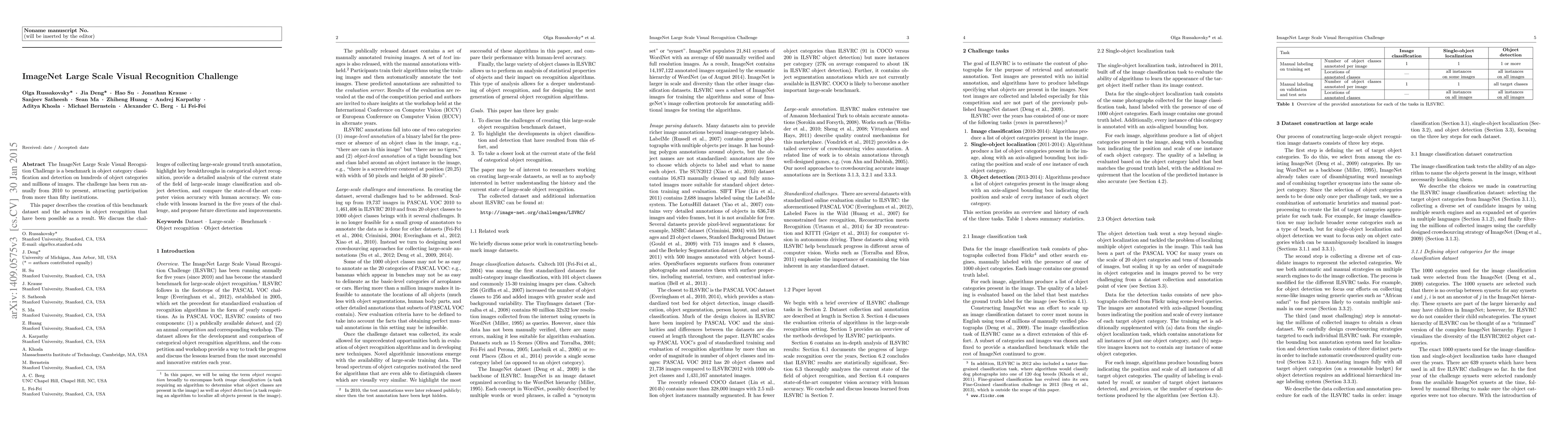 The ImageNet Large Scale Visual Recognition Challenge establishes a benchmark for object classification and detection, showcasing significant advances in computer vision through annual competitions since 2010. The paper details the dataset creation, challenges in annotation, breakthroughs in recognition, and the current state of the field, comparing machine and human accuracy.