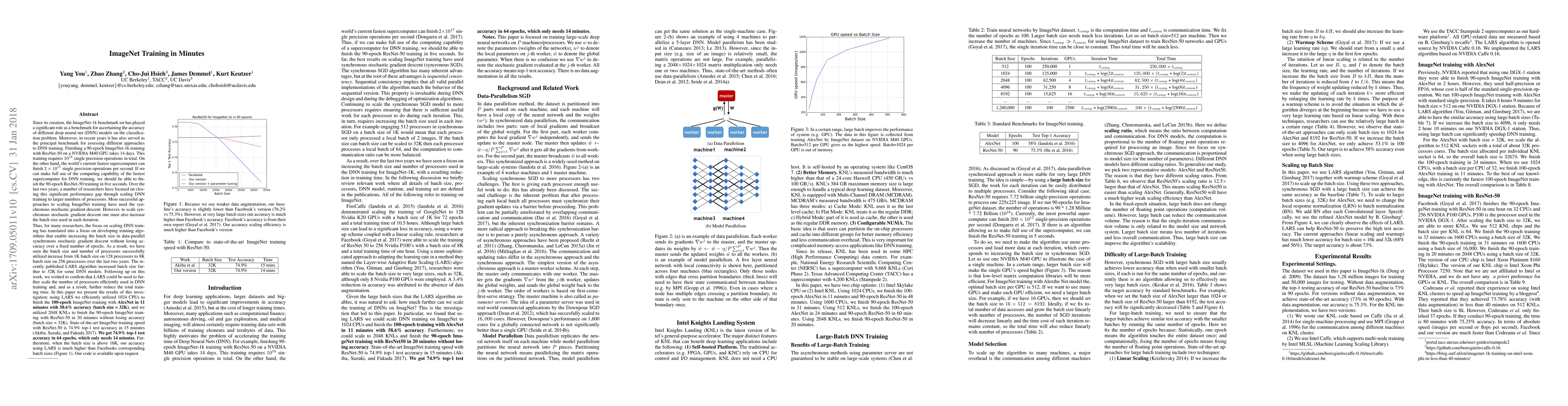 Finishing 90-epoch ImageNet-1k training with ResNet-50 on a NVIDIA M40 GPU takes 14 days. This training requires 10^18 single precision operations in total. On the other hand, the world's current fastest supercomputer can finish 2 * 10^17 single precision operations per second (Dongarra et al 2017, https://www.top500.org/lists/2017/06/). If we can make full use of the supercomputer for DNN training, we should be able to finish the 90-epoch ResNet-50 training in one minute. However, the current bottleneck for fast DNN training is in the algorithm level. Specifically, the current batch size (e.g. 512) is too small to make efficient use of many processors. For large-scale DNN training, we focus on using large-batch data-parallelism synchronous SGD without losing accuracy in the fixed epochs. The LARS algorithm (You, Gitman, Ginsburg, 2017, arXiv:1708.03888) enables us to scale the batch size to extremely large case (e.g. 32K). We finish the 100-epoch ImageNet training with AlexNet in 11 minutes on 1024 CPUs. About three times faster than Facebook's result (Goyal et al 2017, arXiv:1706.02677), we finish the 90-epoch ImageNet training with ResNet-50 in 20 minutes on 2048 KNLs without losing accuracy. State-of-the-art ImageNet training speed with ResNet-50 is 74.9% top-1 test accuracy in 15 minutes. We got 74.9% top-1 test accuracy in 64 epochs, which only needs 14 minutes. Furthermore, when we increase the batch size to above 16K, our accuracy is much higher than Facebook's on corresponding batch sizes. Our source code is available upon request.