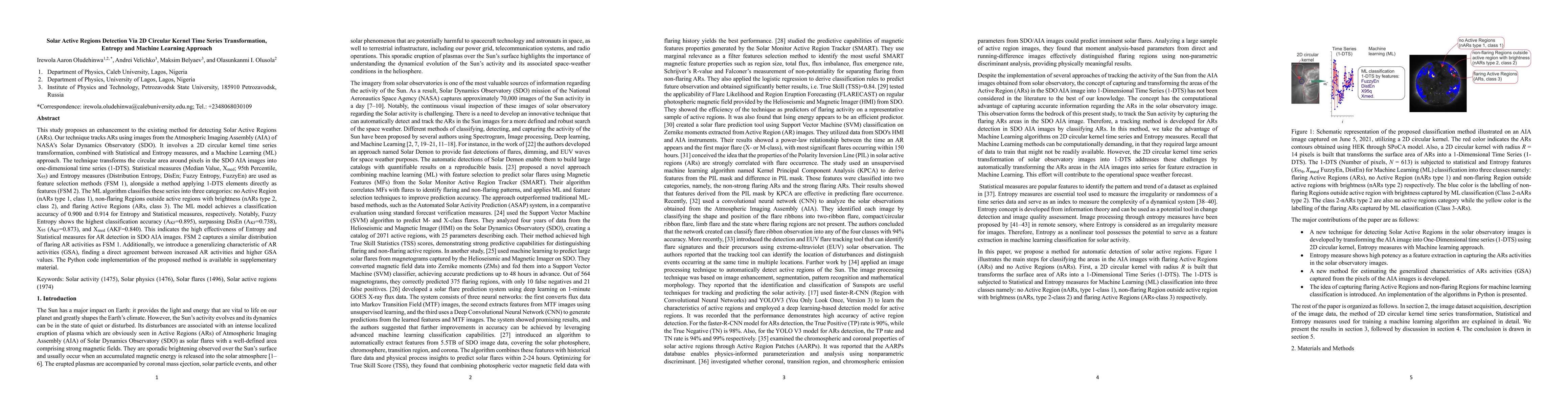 This paper presents a technique for tracking solar activity using a 2D circular kernel time series transformation, entropy measures, and machine learning. The approach transforms solar images into 1-D time series for feature extraction, achieving high accuracy in classifying solar storms.