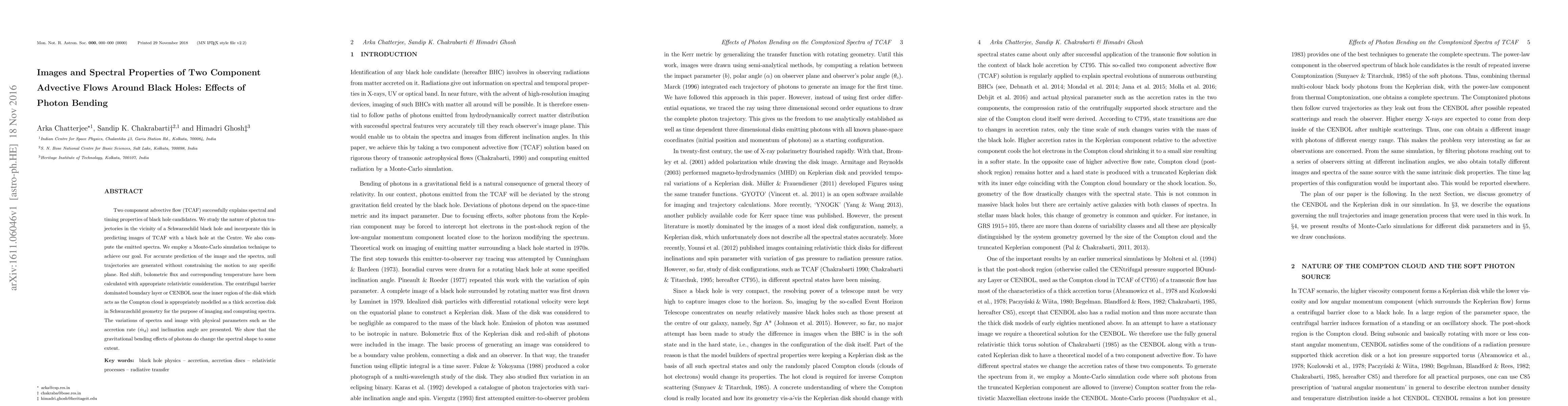 This paper investigates the spectral and imaging properties of two-component advective flows around black holes using Monte-Carlo simulations. It models photon trajectories and emitted spectra in the vicinity of a Schwarzschild black hole, showing that gravitational bending alters spectral shape, with variations dependent on accretion rate and inclination angle.