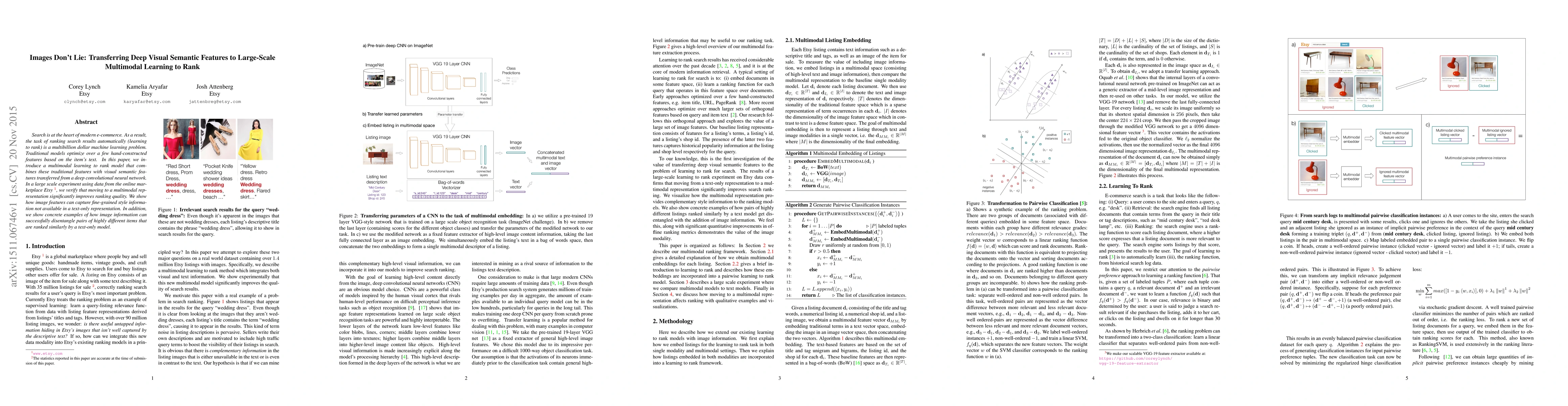This paper presents a multimodal learning to rank model that integrates deep visual semantic features from convolutional neural networks with traditional text-based features to enhance search result ranking in e-commerce. Experimental results on Etsy data show significant improvements in ranking quality, demonstrating that image features capture fine-grained style details that text alone cannot.