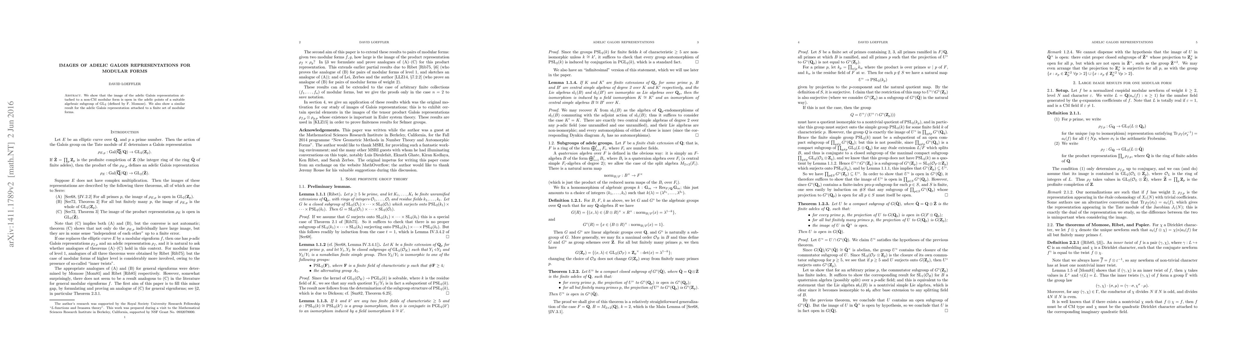 Summary: This paper demonstrates that the image of the adelic Galois representation linked to non-CM modular forms is open in the adelic points of a corresponding algebraic group. Additionally, it extends this result to adelic Galois representations for a finite set of modular forms.