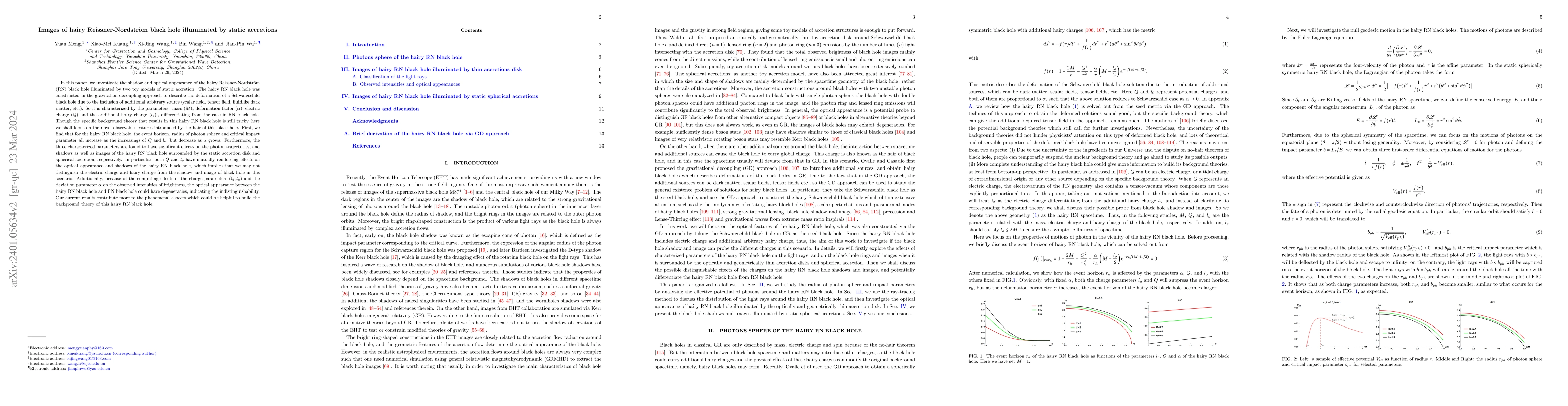 We investigate the shadow and optical appearance of the hairy Reissner-Nordstr\"{o}m (RN) black hole illuminated by two toy models of static accretion. The hairy RN black hole was constructed in the gravitation decoupling approach to describe the deformation of a Schwarzschild black hole due to the inclusion of additional arbitrary source (scalar field, tensor field, fluidlike dark matter, etc). So it is characterized by the parameters: mass ($M$), deformation factor ($\alpha$), electric charge ($Q$) and the additional hairy charge ($l_o$), differentiating from the case in RN black hole. Though the specific background theory that results in this hairy RN black hole is still tricky, here we shall focus on the novel observable features introduced by the hair of this black hole. First, we find that for the hairy RN black hole, the event horizon, radius of photon sphere and critical impact parameter all increase as the increasings of $Q$ and $l_o$, but decrease as $\alpha$ grows. The three characterized parameters are found to have significant effects on the photon trajectories, shadows and images of hairy RN black hole surrounded by the static accretion disk and spherical accretion, respectively. Particularly, both $Q$ and $l_o$ have mutually reinforcing effects on the optical appearance and shadows of the hairy RN black hole, which implies that we may not distinguish the electric charge and hairy charge from the shadow and image of black hole in this scenario. Additionally, because of the competing effects of the charge parameters ($Q, l_o$) and the deviation parameter $\alpha$ on the observed intensities of brightness, the optical appearance between the hairy RN black hole and RN black hole could have degeneracies, indicating the indistinguishability. Our current results contribute more to the phenomenal aspects which could be helpful to build the background theory of hairy RN black hole.