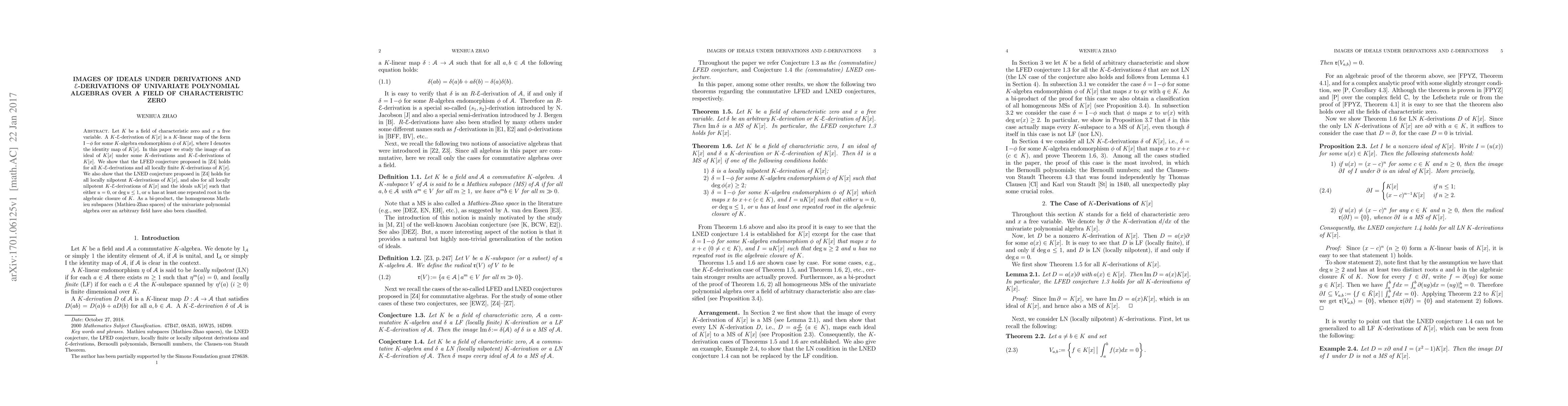 The paper investigates ideal images under derivations and ‾-derivations of univariate polynomial algebras over fields of characteristic zero, confirming the LFED and LNED conjectures for specific types of derivations.
