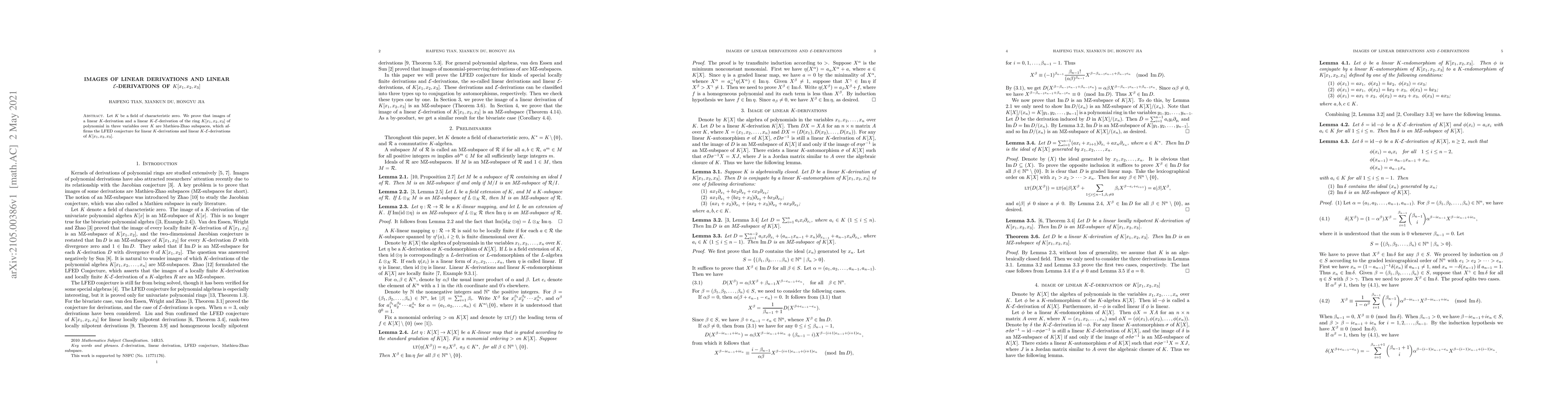 This paper proves that images of linear K-derivations and linear K-E-derivations in the polynomial ring K[x₁, x₂, x₃] over a field K of characteristic zero are Mathieu-Zhao subspaces, thereby confirming the LFED conjecture for these derivations.