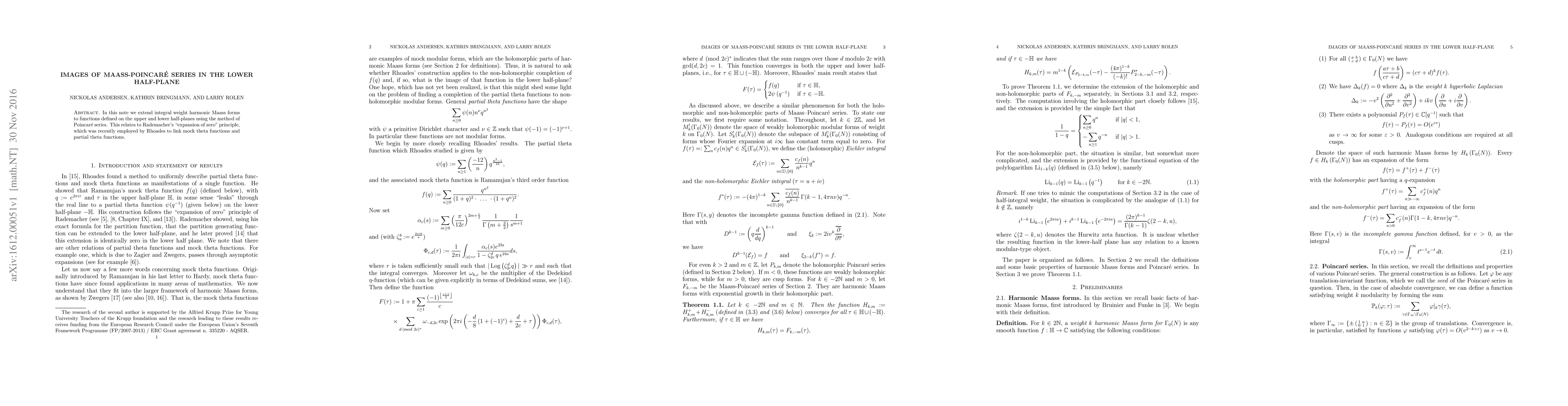 In this note we extend integral weight harmonic Maass forms to functions defined on the upper and lower half-planes using the method of Poincar\'e series. This relates to Rademacher's "expansion of zero" principle, which was recently employed by Rhoades to link mock theta functions and partial theta functions.