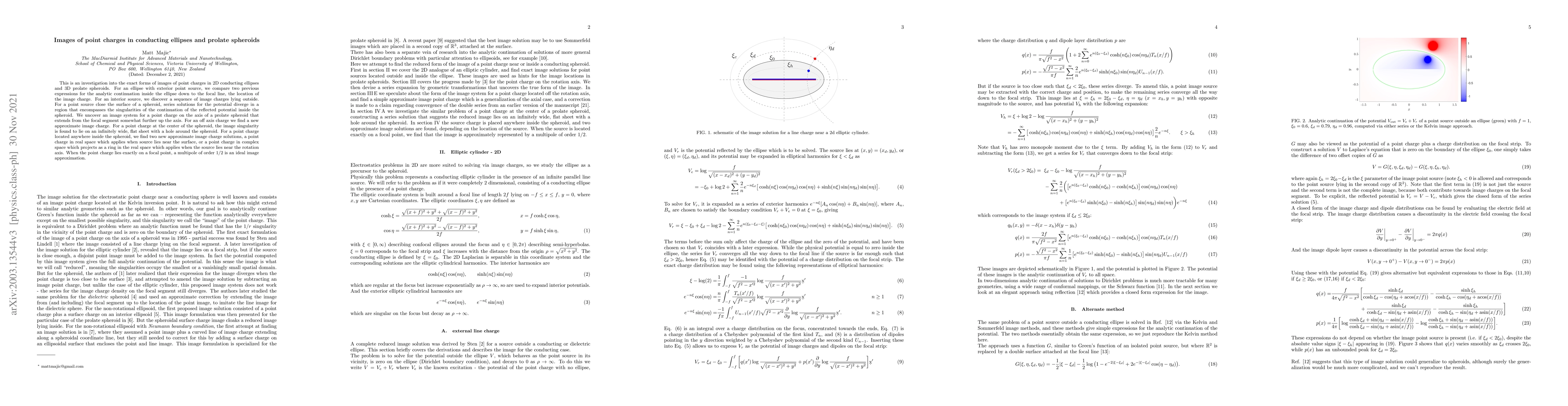 This is an investigation into the exact forms of images of point charges in 2D conducting ellipses and 3D prolate spheroids. For an ellipse with exterior point source, we compare two previous expressions for the analytic continuation inside the ellipse down to the focal line, the location of the image charge. For an interior source, we discover a sequence of image charges lying outside. For a point source close the surface of a spheroid, series solutions for the potential diverge in a region that encompasses the singularities of the continuation of the reflected potential inside the spheroid. We uncover an image system for a point charge on the axis of a prolate spheroid that extends from the focal segment somewhat further up the axis. For an off axis charge we find a new approximate image charge. For a point charge at the center of the spheroid, the image singularity is found to lie on an infinitely wide, flat sheet with a hole around the spheroid. For a point charge located anywhere inside the spheroid, we find two new approximate image charge solutions, a point charge in real space which applies when source lies near the surface, or a point charge in complex space which projects as a ring in the real space which applies when the source lies near the rotation axis. When the point charge lies exactly on a focal point, a multipole of order 1/2 is an ideal image approximation.