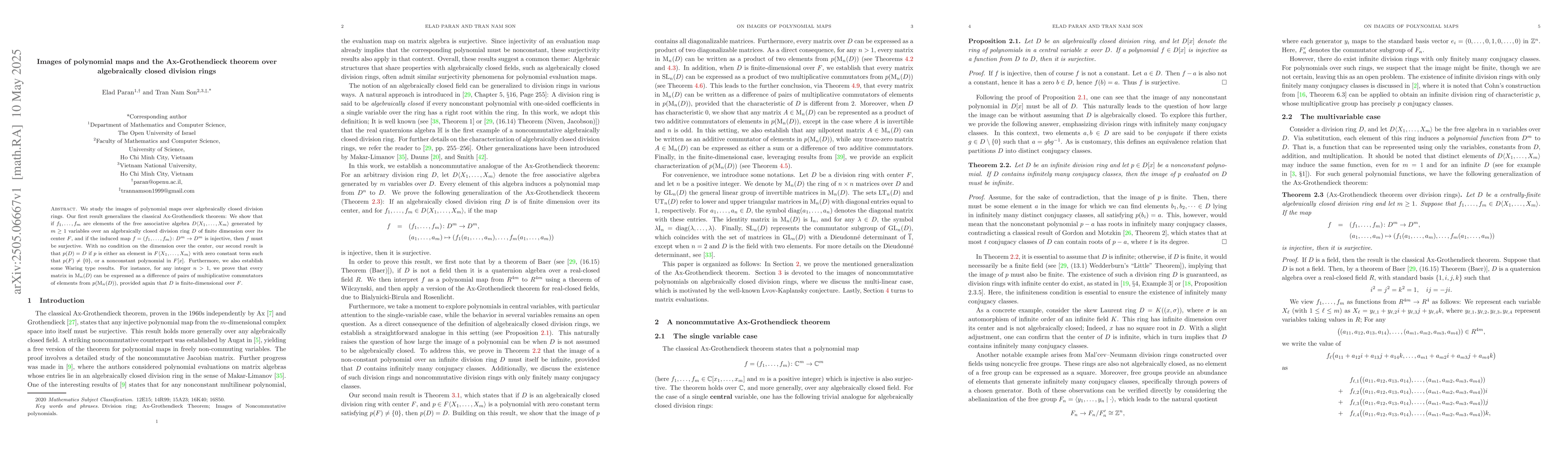 The paper generalizes the Ax-Grothendieck theorem by studying polynomial maps over algebraically closed division rings, focusing on injectivity and surjectivity conditions.