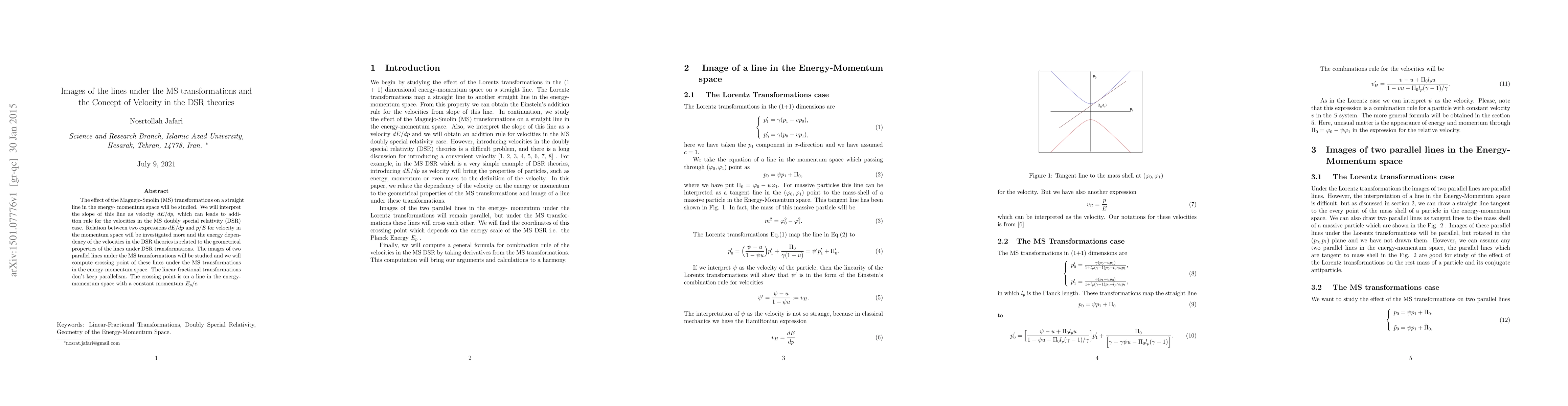 The effect of the Maguejo-Smolin (MS) transformations on a straight line in the energy- momentum space will be studied. We will interpret the slope of this line as velocity $dE/dp$, which can leads to addition rule for the velocities in the MS doubly special relativity (DSR) case. Relation between two expressions $dE/dp$ and $p/E$ for velocity in the momentum space will be investigated more and the energy dependency of the velocities in the DSR theories is related to the geometrical properties of the lines under DSR transformations. The images of two parallel lines under the MS transformations will be studied and we will compute crossing point of these lines under the MS transformations in the energy-momentum space. The linear-fractional transformations don't keep parallelism. The crossing point is on a line in the energy-momentum space with a constant momentum $E_p/c$.